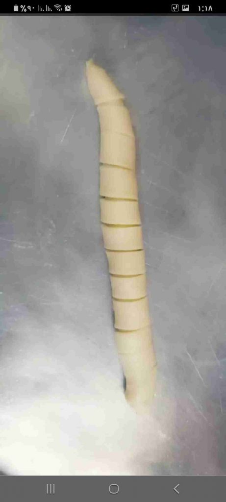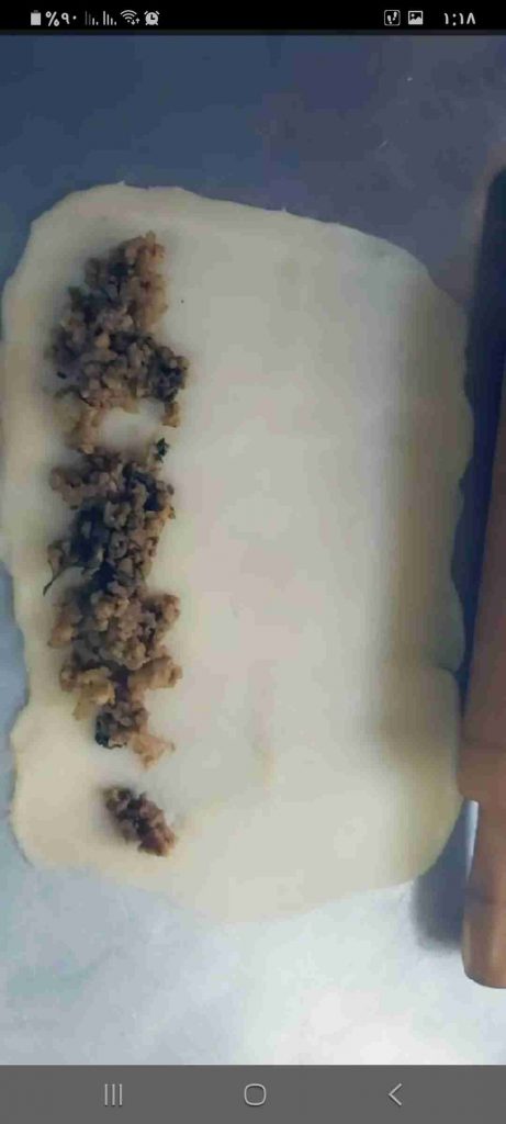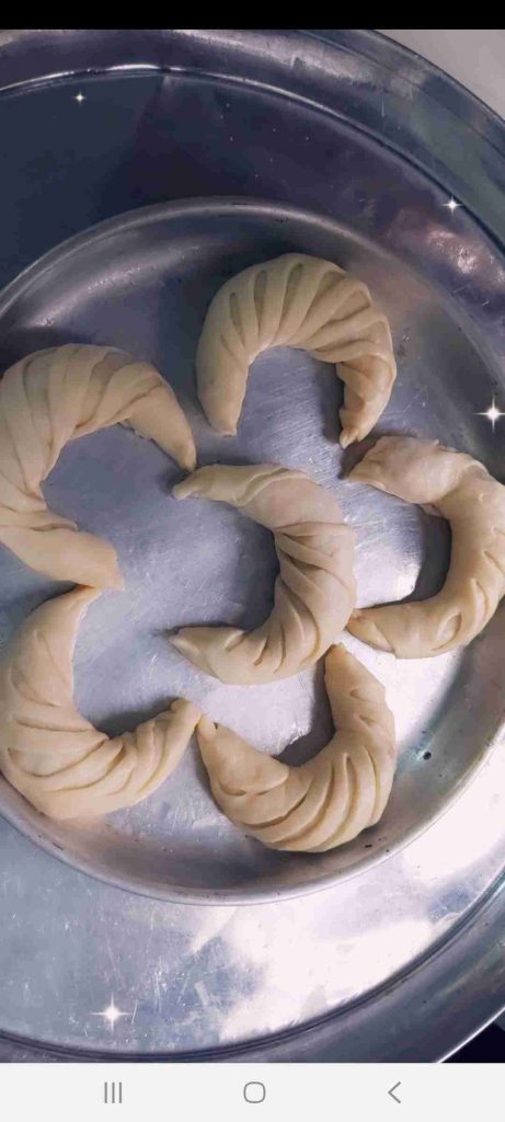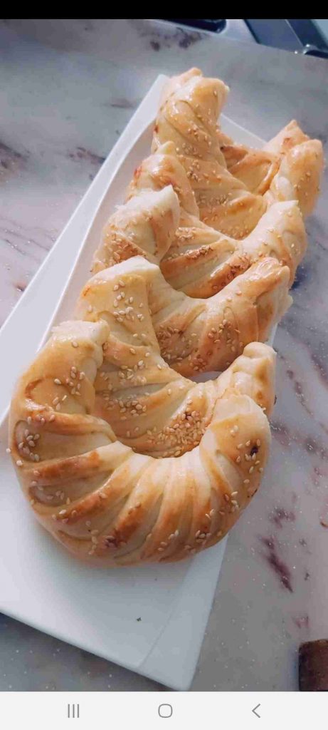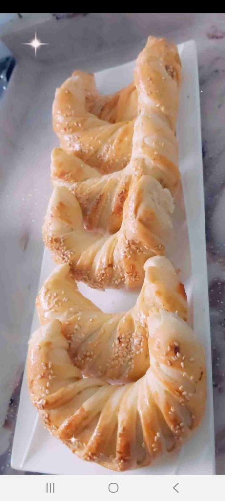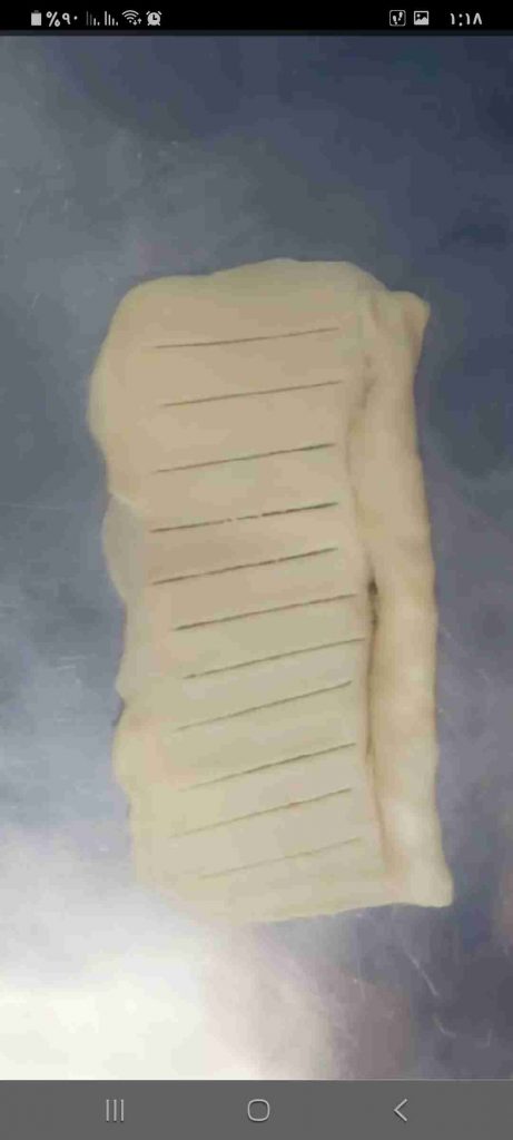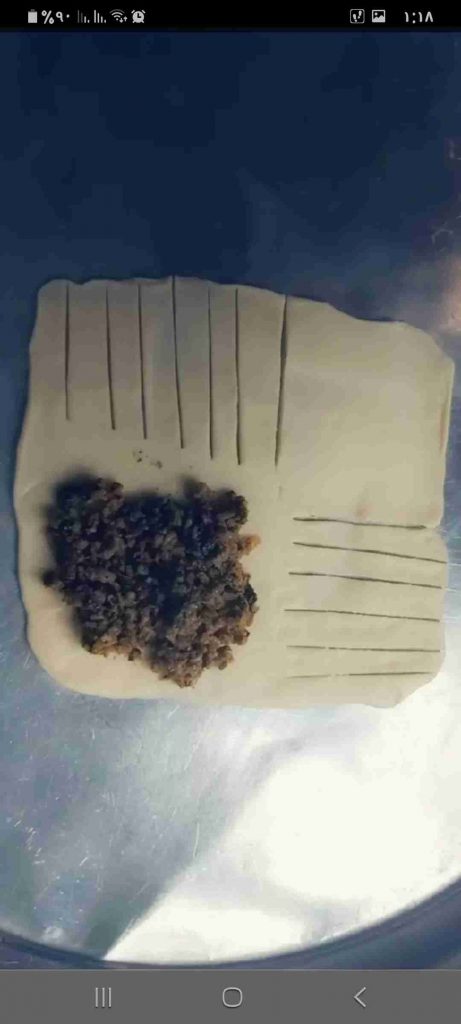 أبدأ بعمل الشكل المرغوب للفطائر…هنا وضحت ٣ اشكال سهلة و جميلة لتشكيل الفطائر ان شاء الله تتوضح بالصور هي شكل الحصيرة والهلال والمبرومة….