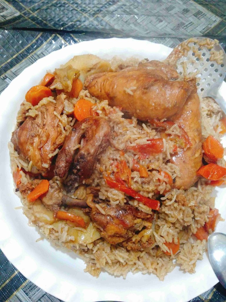 ثم نقوم بقلي الخضراوات ونبدأ بالجزر ثم البطاطا والزهرة ثم الباذنجان .واخر شي الدجاج