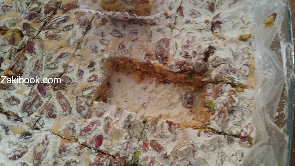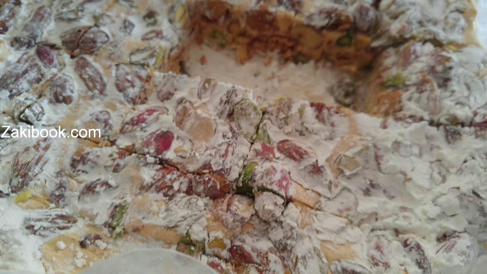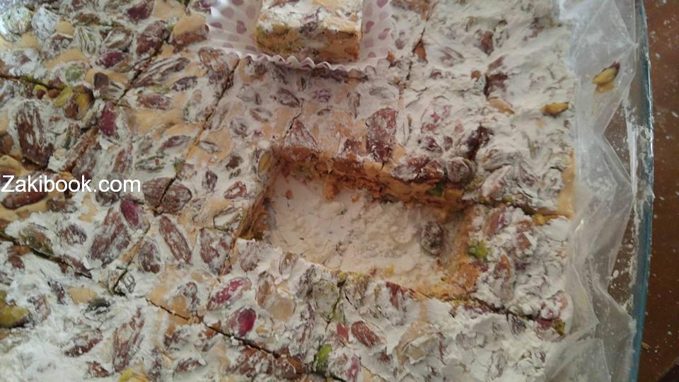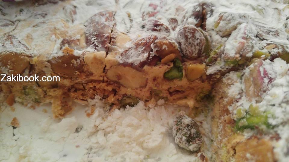 ٩- صبي المزيج في الطبق وسوي السطح وأضيفه له طبقة غنية من المكسرات مثل الفستق الحلبي واللوز والجوز ورشيه بطبقه كثيفه من النشاء, وممكن استبدال النشا بالسكر البودرة.