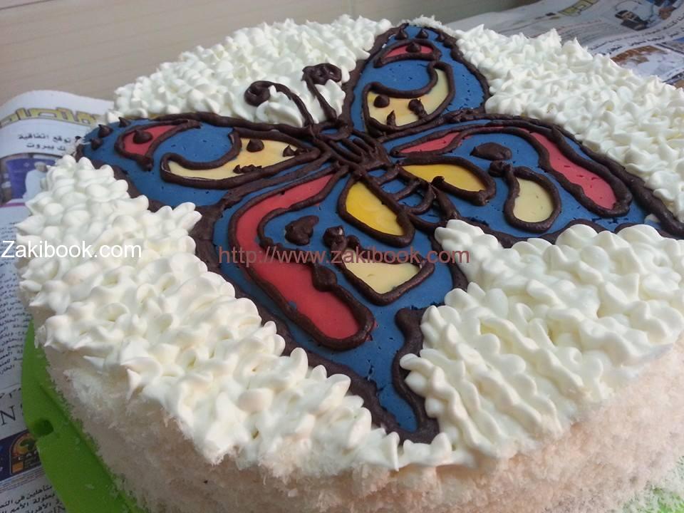 7 – تكونين قد جهزت الكيكة وحشوتها وزينتها بالكريم شانتيه المناسب لألوان الرسمة التي إخترتها