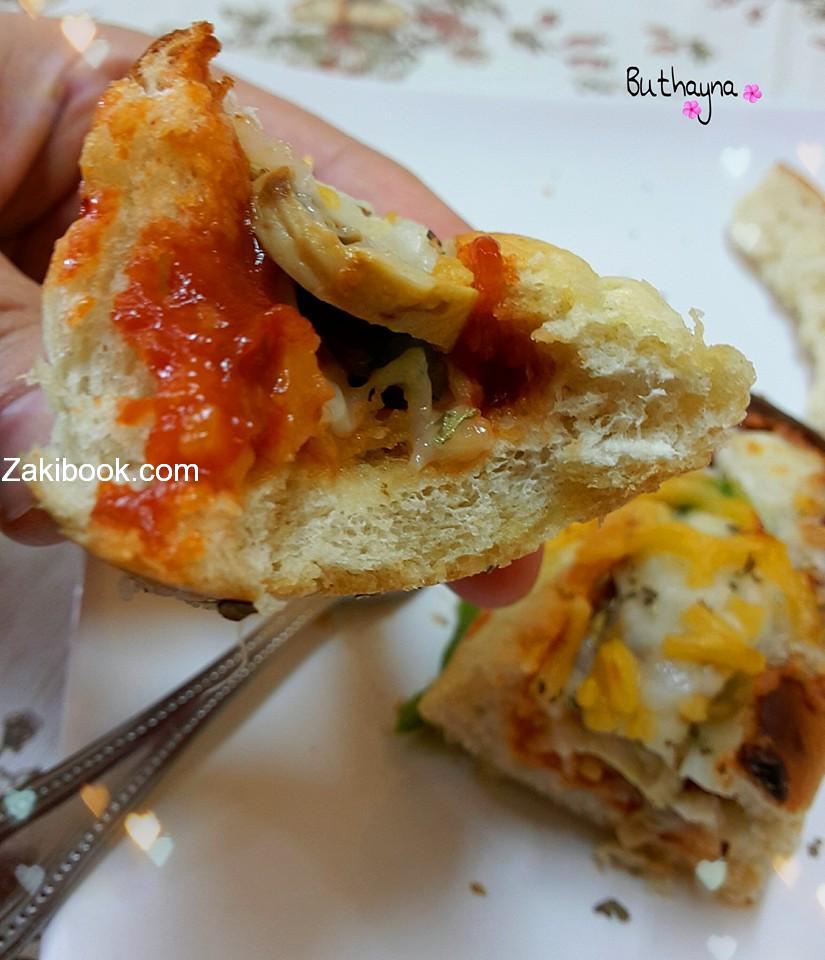 بسيطة كتير فرغت الخبز من جوا دهنتو زيت زيتون وشويتو بالفرن شوي بعدين حطيت صلصة بيتزا وجبنة تشدر وموزيريلا وفلفل حلو وفطر وشويتها لدابت الجبنة.