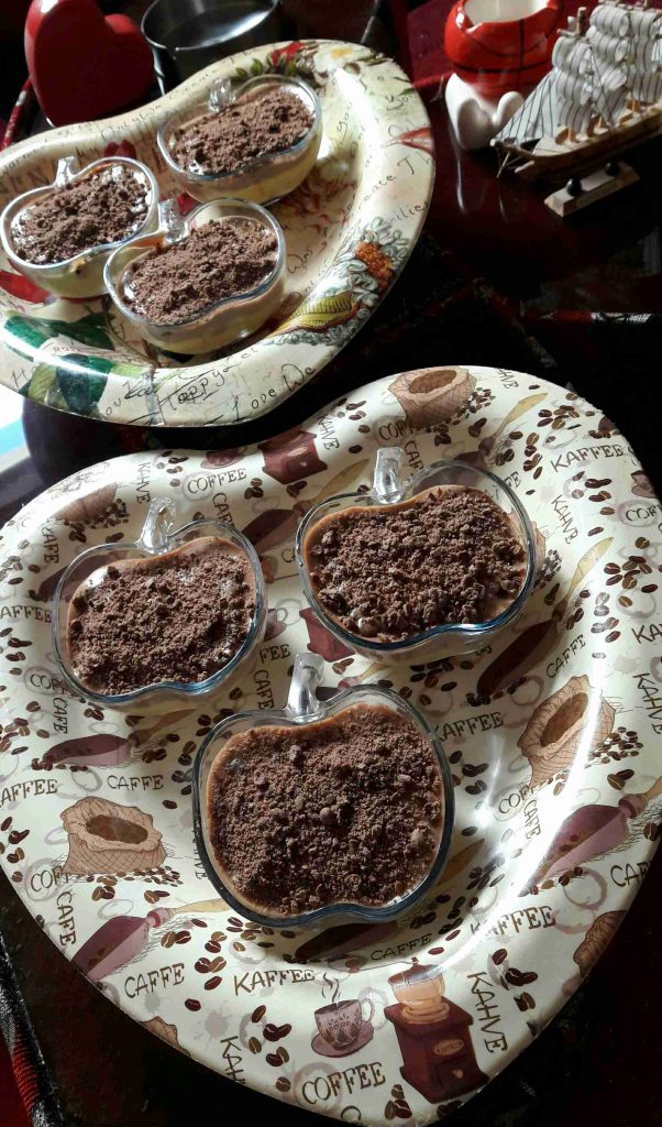 اول شي بطنجره بنحط بودره الكريم كراميل والحليب والسكر وبنحركهم وبعدين ع الغاز لحتى يتقل الخليط ، بنكون مفرغين الصوص تبع الكريم كراميل بالصحون بنسكب جزء من الخليط بالصحون ، وبنحط بسكوت (اختياري)