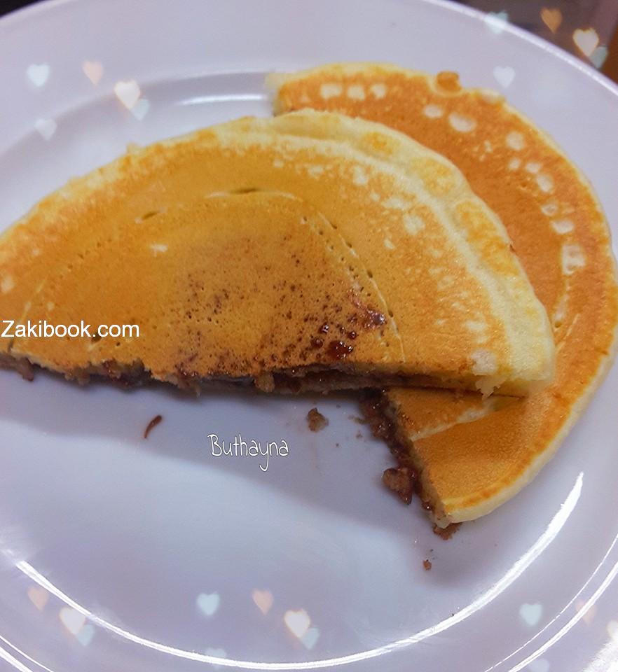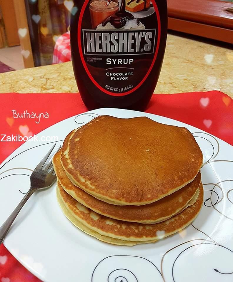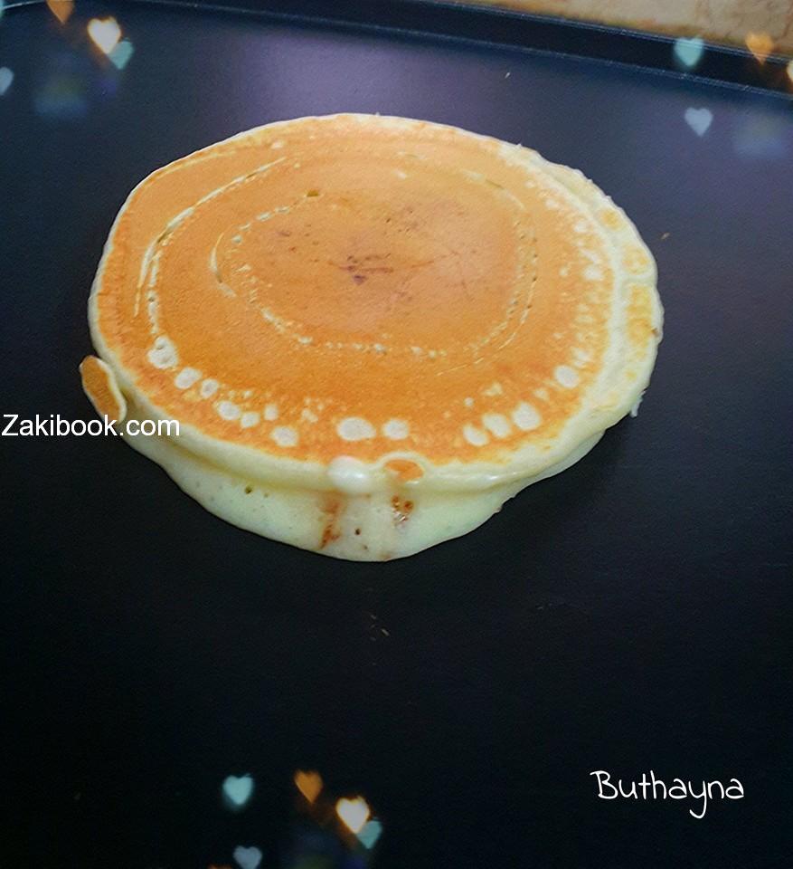 بنترك الخليط نص ساعة بعدين بنحمي مقلاية غير لاصقة او صاج وما بندهن اشي وبنحط كميات متساوية من العجينة مقدار واحد ..يعني مغرفة وحدة بنستخدم عشان يطلع نفس الحج وبس يبلش تنشف اطرافو ويتحمر من تحت بنقلبو على الجهة التانية ..وبنقدمو صحتين