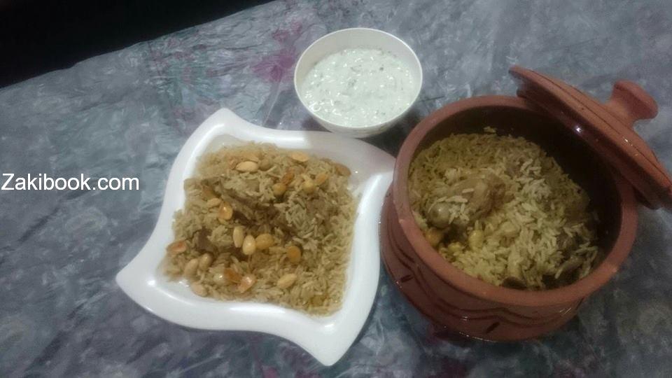 ٧. يسكب الارز ويوضع فوقه اللحم والمكسرات ثم يقدم. مع سلطة خيار بلبن