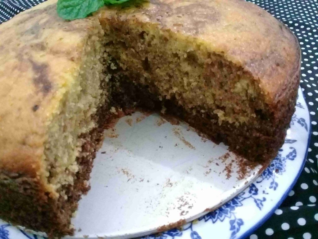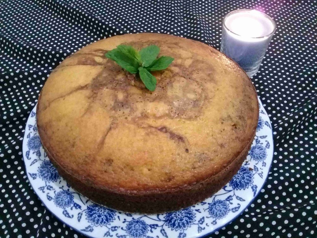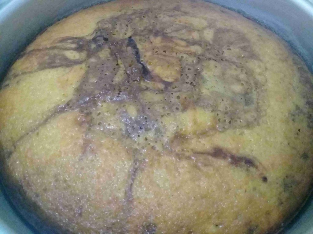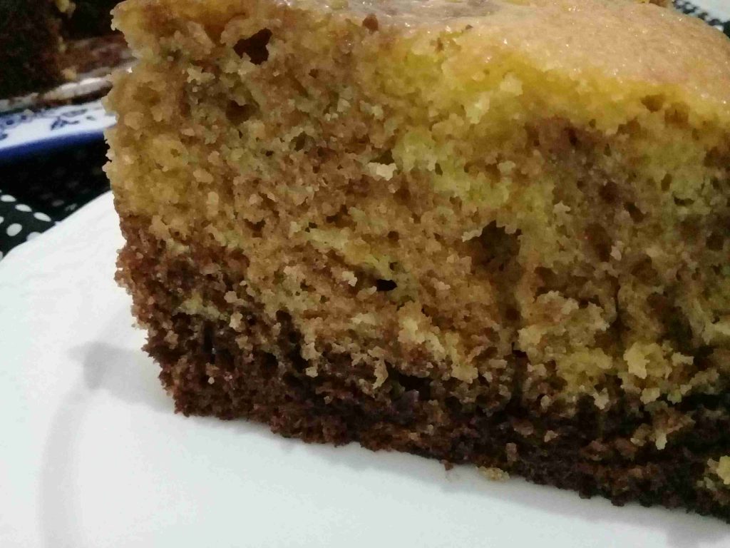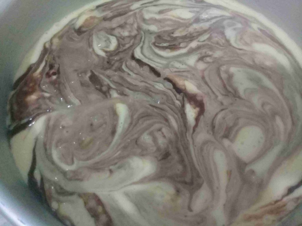 بنصب نص الخليط بصينيه مدهونه بزيت ورشه طحين والنص التاني بنضيف عليه معلقه الكاكاو وبنحركه كويس بنضيفه بشكل عشوائي للخليط إلي بالأول وبمعلقه بنعمل خطوط عشوائيه وعلى الفرن من فوق بعد مرور ٣٠ دقيقه بنشوف كيف وضعها ههههه
