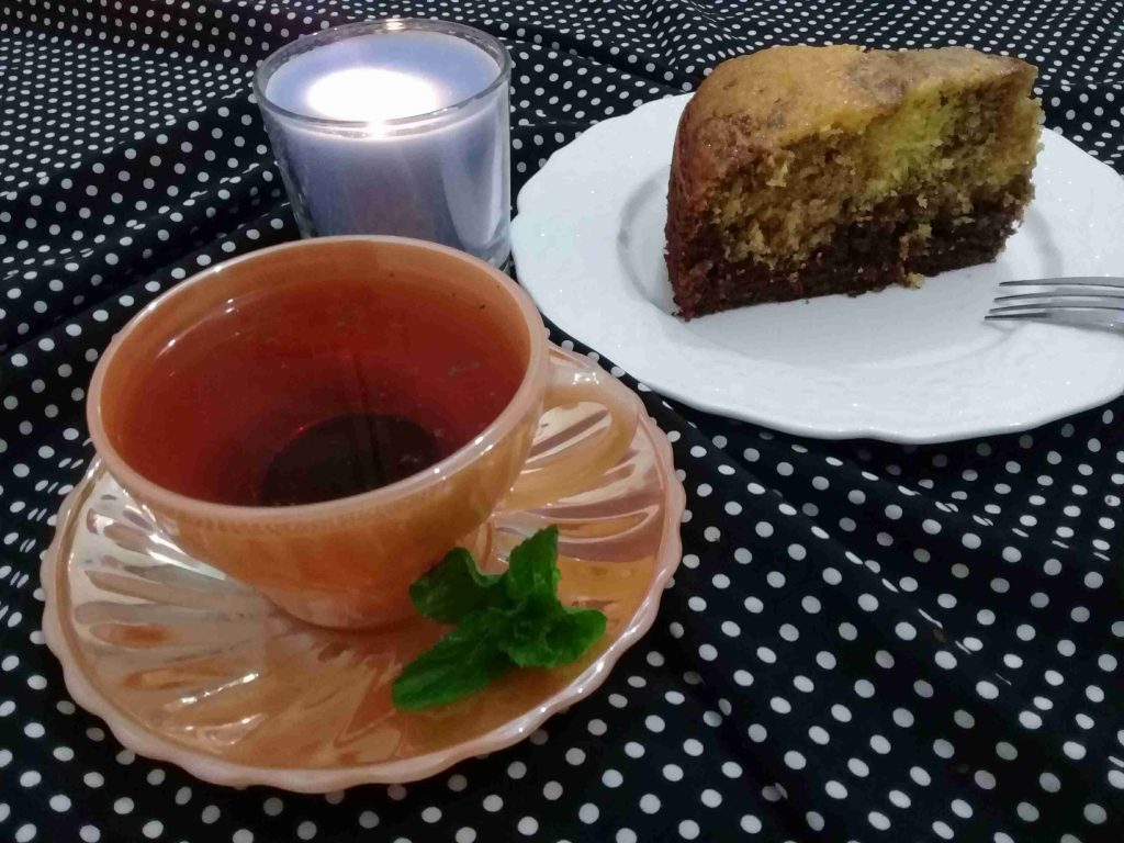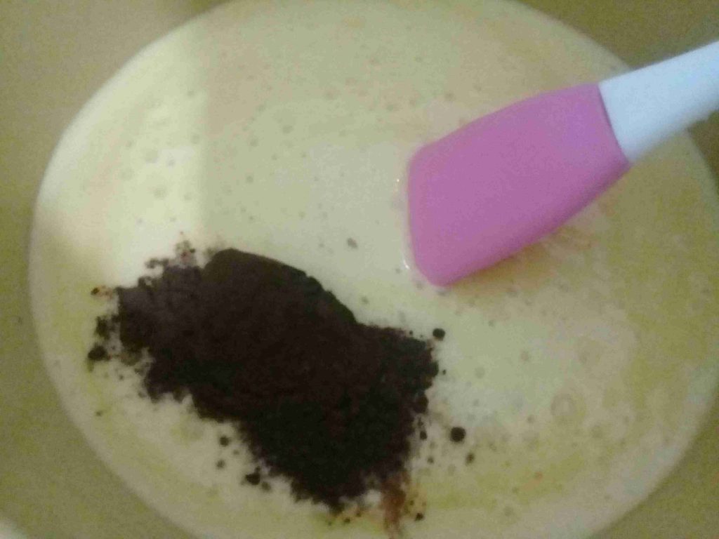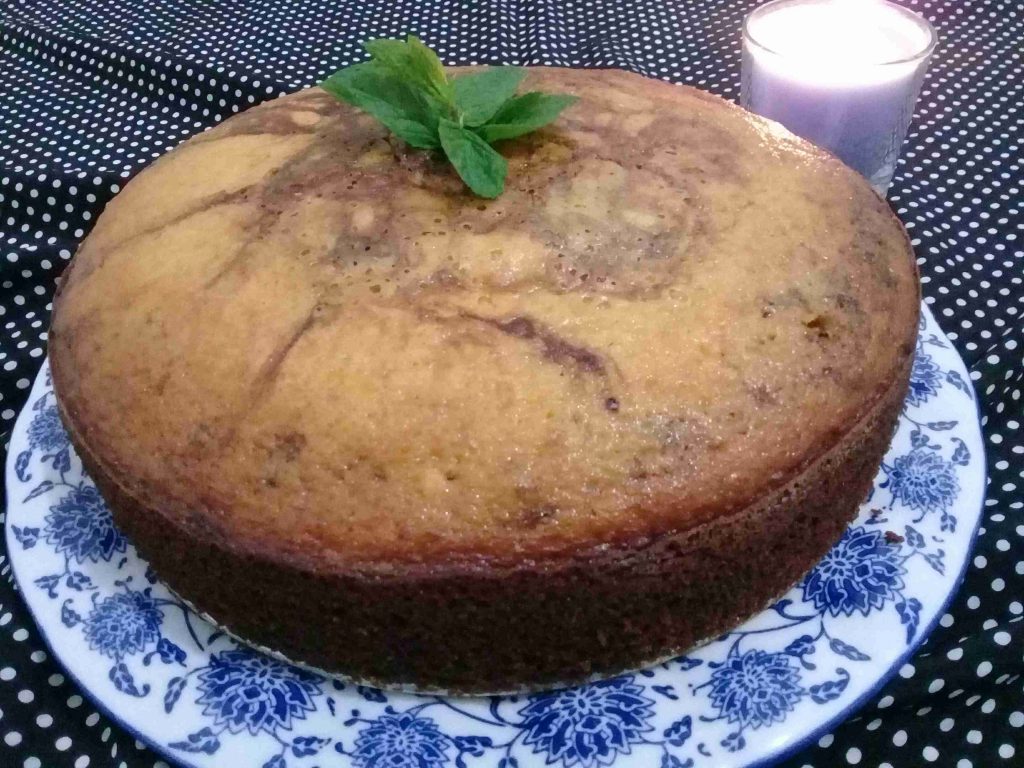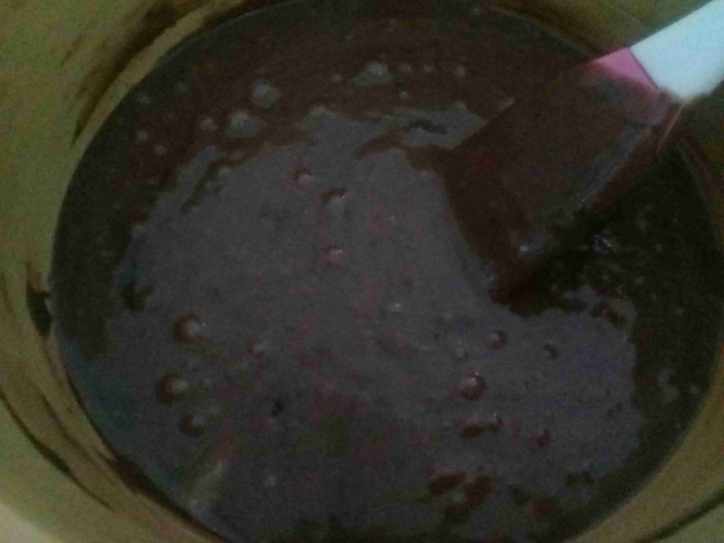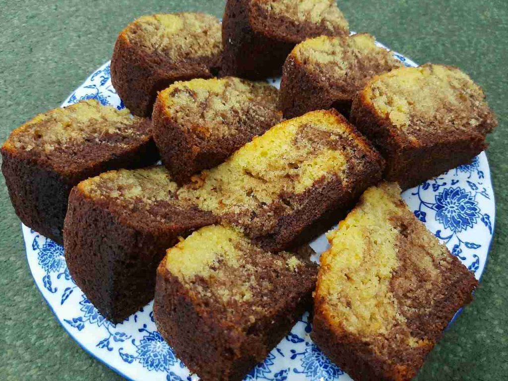 بنصب نص الخليط بصينيه مدهونه بزيت ورشه طحين والنص التاني بنضيف عليه معلقه الكاكاو وبنحركه كويس بنضيفه بشكل عشوائي للخليط إلي بالأول وبمعلقه بنعمل خطوط عشوائيه وعلى الفرن من فوق بعد مرور ٣٠ دقيقه بنشوف كيف وضعها ههههه