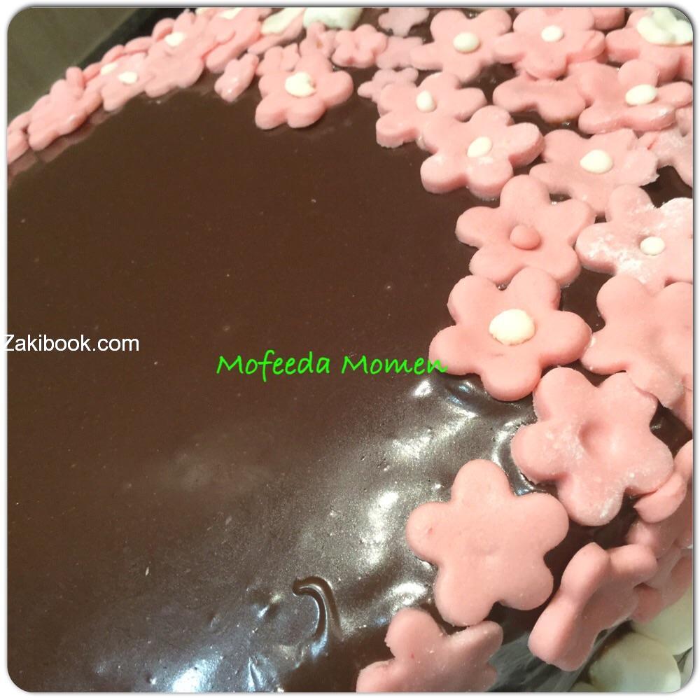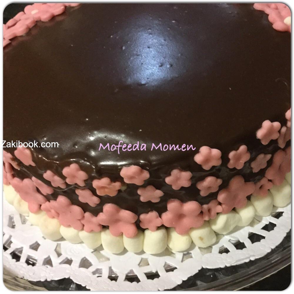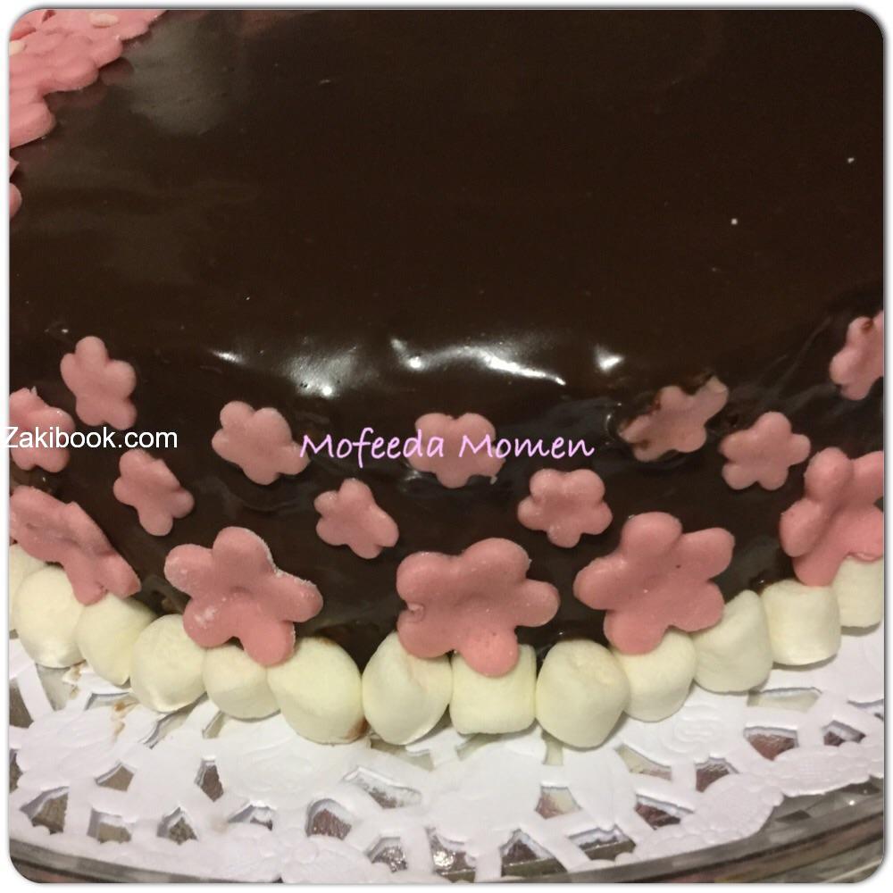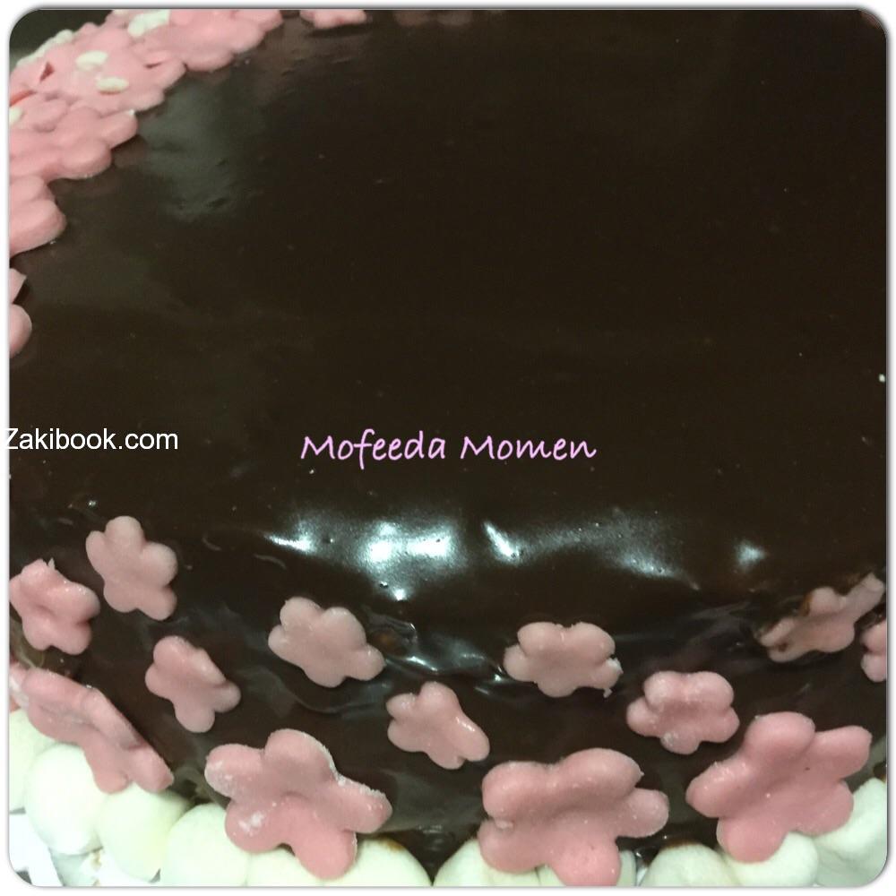 نجهز ٣/٤ كوب كريمة خفق وارفعها علي النار وقرب ماتبدأ تظهر فقاقيع وقبل ماتغلي نرفعها عن النار ونضيف اليها شيكولاتة مقطعة كوب وملعقتين زبدة مع التقليب حتي تذوب تماما وتصب علي الكيكة وهي بارده وتترك في الثلاجة