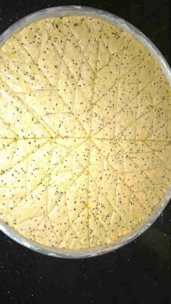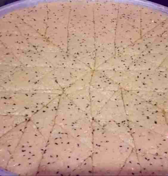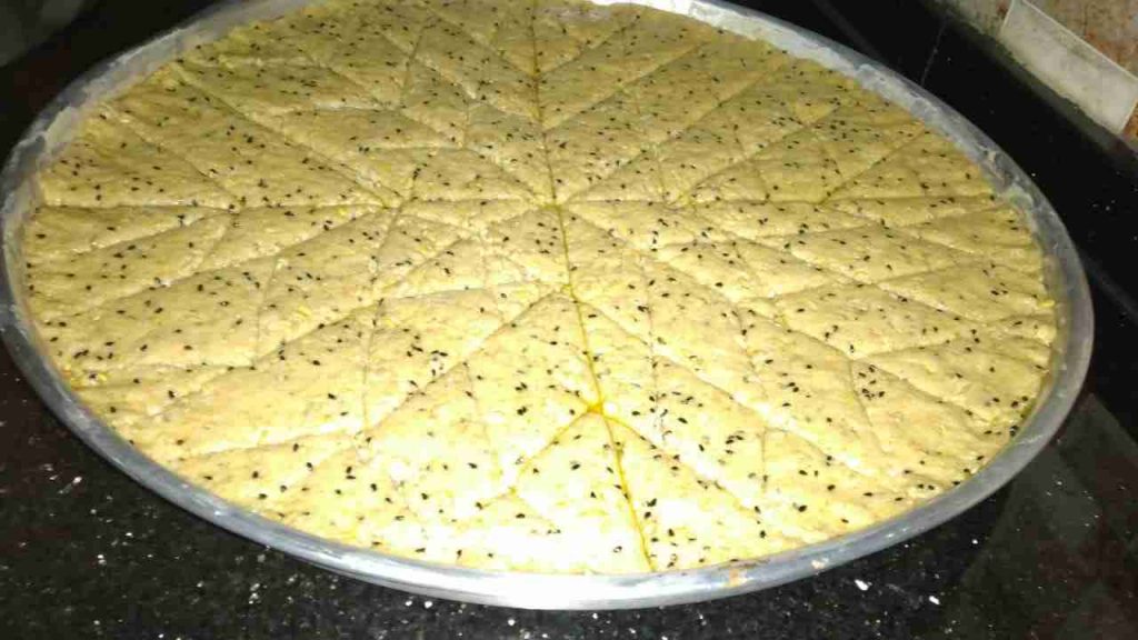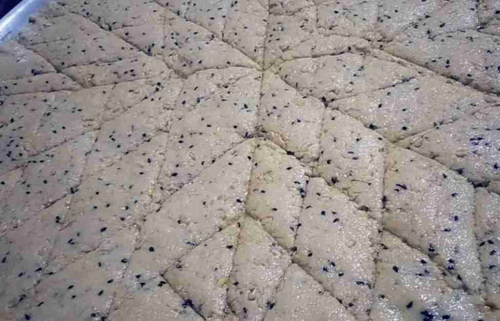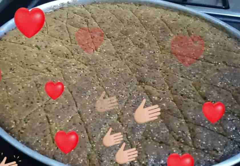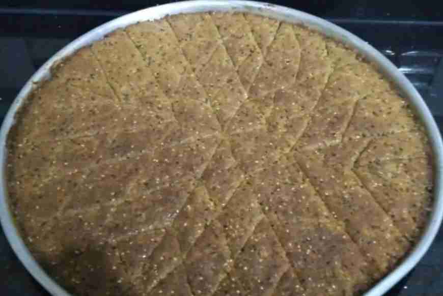 أول شي نضع السميد والطحين والسمسم والقزحة والبيكنغ باودر و الحليب و السكر و الخميرة و اليانسون و نخلطهم جيدآ ثم نضع الزيت ونبسهم جيدآ ثم وضع حبوب الحلبة وخلطهم وبعدين منعجنهم بماء الحلبة ومنتركهم يرتاحو نص ساعة وبعدين مندهن الصينية أو السدر بالطحينية ومنحط الخليط ومنفردو ومنقطعها وعلى الفرن مباشرة لحتى تتحمر أطرافها منحمر الوجه ومنسقيها بالقطر البارد وتقدم بالهنا والعافية