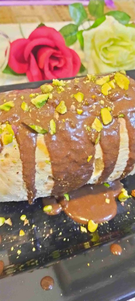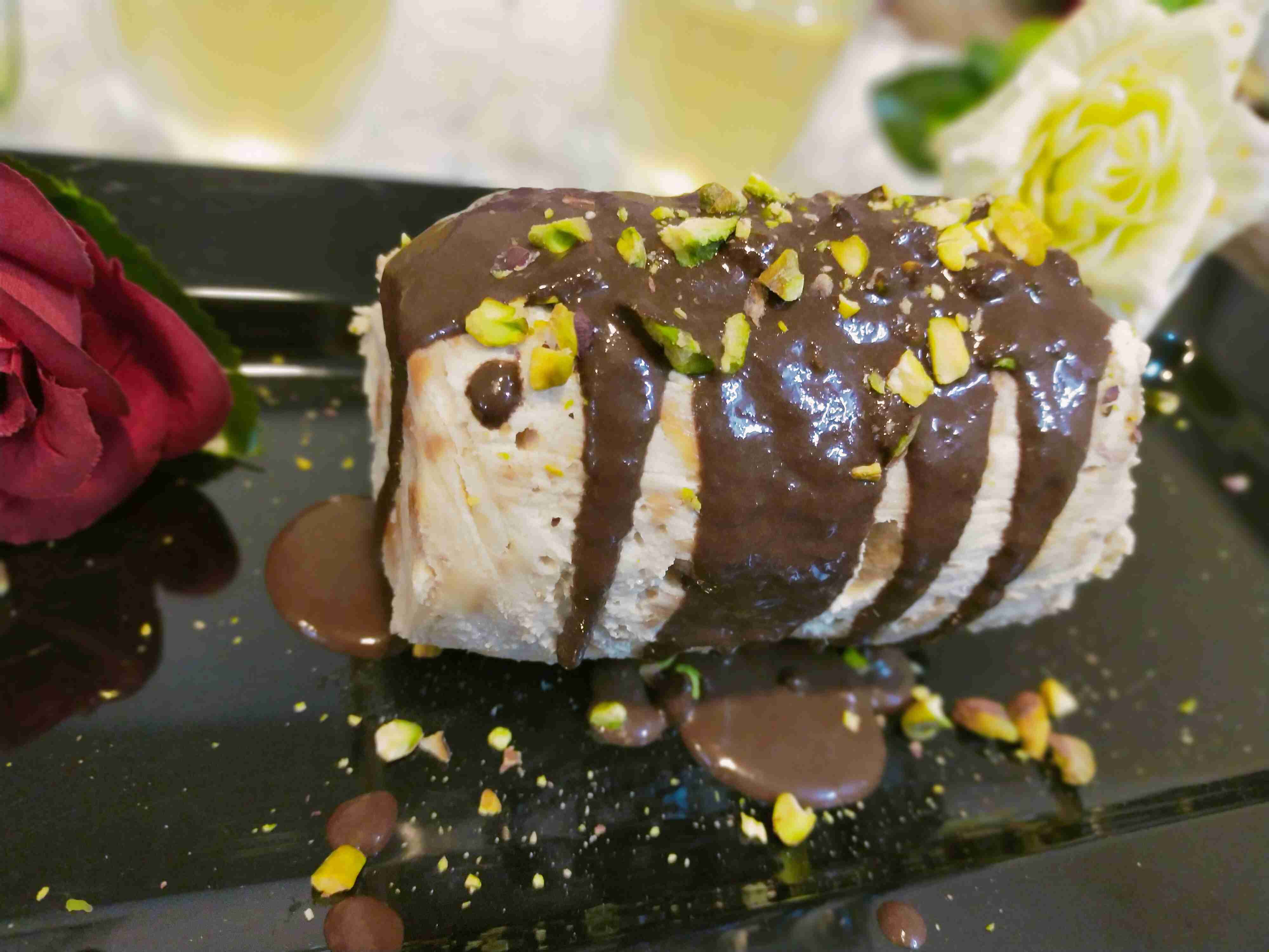 أضفت لفجنان الكريمه ملعقه الكاكاو وزينت به الكيك مع الفستق