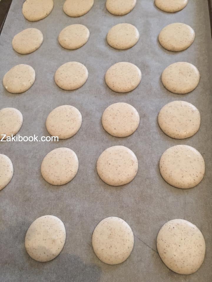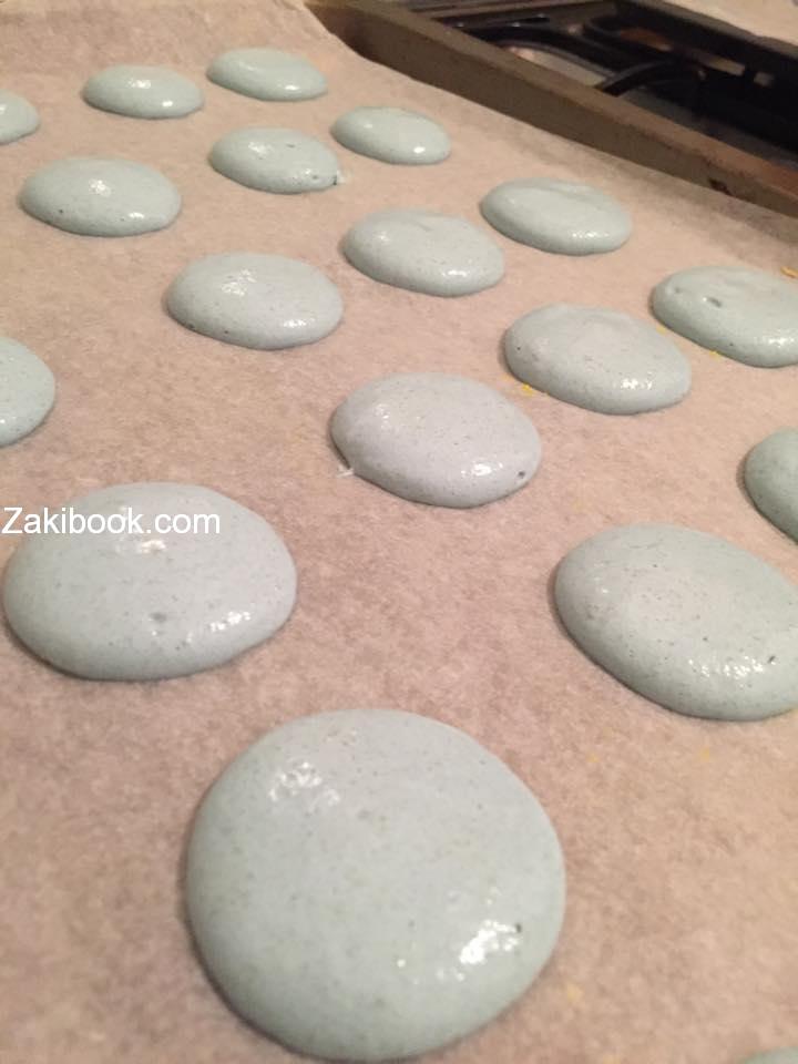 وشغلي الفرن من تحت على 150 خليها مشغله 10 دقائق مثلا قبل وضع الماكرون هو يحتاج لوقت تقريبا 10 دقائق ونتركه يبرد نهائي بالورق ومن بعد نرفعه ممكن تحشيه او تخزنيه لوقت التقديم تحشيه انا حشيته بخليط من المربى والكراميل