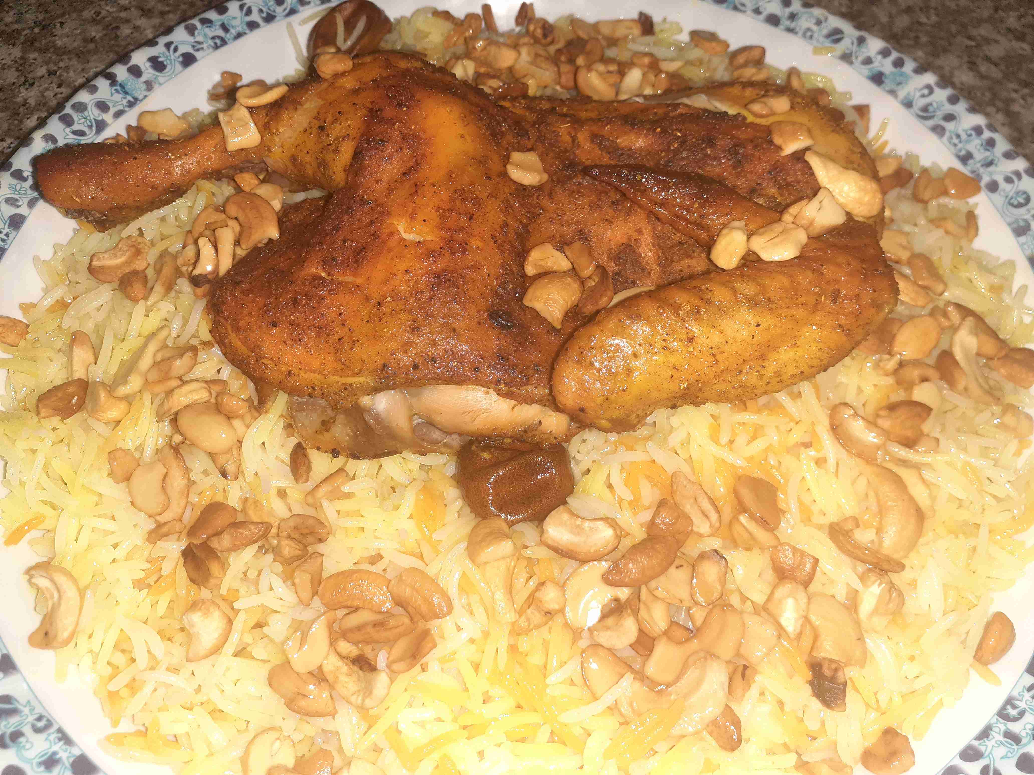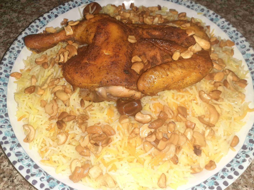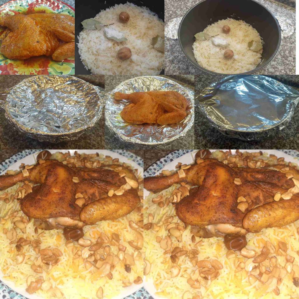 بعدين بجيب الرز وبحط لكل كوب أرز كوب ونص ماء بعدين منحط قصدير ومنحاول انو ننزل القصدير لتحت ( تجوير ) حتى لما نحط الدجاج يكون معنا لتحت ويستوي منيح طبعآ انا حطيت طبقتين من القصدير فوق الأرز بعدين خزقت القصدير بالسكين وحطيت الدجاج فوقه وقصدرتو منيح كتييييير وعلى الفرن مباشرة لمدة ساعة ونص الى ساعتين على حرارة 180 درجة بعدين اكشفي عن الدجاج وحمري وهووووووون الحلو لما تفتحي على الأرز وتخلطي بكون تلون من الخلطة الي على الجاج حركيهم بالشوكة وقدميه ورشي علي شوية مكسرات الي بتجبيها وقدمي جنبو الدقوس وتلذذي بالطعم الررررررررررهيب وريتو عوافي ع قلب الجميع