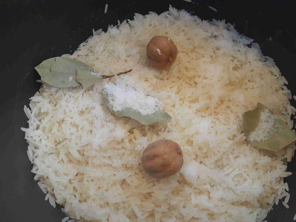 اول شي مننقع الأرز لمدة نص ساعة بعدين منغسلو ومنحطو بالطنجرة الي بدنا نحطها بالفرن ومنحط عليها زيت قلي لحاجة الأرز يعني شي 4 معالق كبار ومنحط البهارات الصحيحة والملح