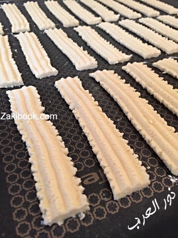 وخلي بجنبك طحين وإنتي تشتغلي بالبسكوت سواء بالماكينة او الكيس حتى تغمسي أصابعك بالطحين وماتلصق العجين