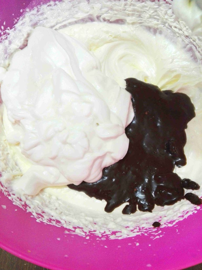 & بنخفق الكريما والسكر والحليب البارد سوا لحتى تنفش معي الكريما وبعدين بنضيفلهم القشطه (ومعلقتين الماء عليهم معلقة نسكافيه ومعلقتين كاكاو مخلوطين سوا) بضيفهم عالكريما وبخفقهم سوا وهيك الكريما جاهزه معنا