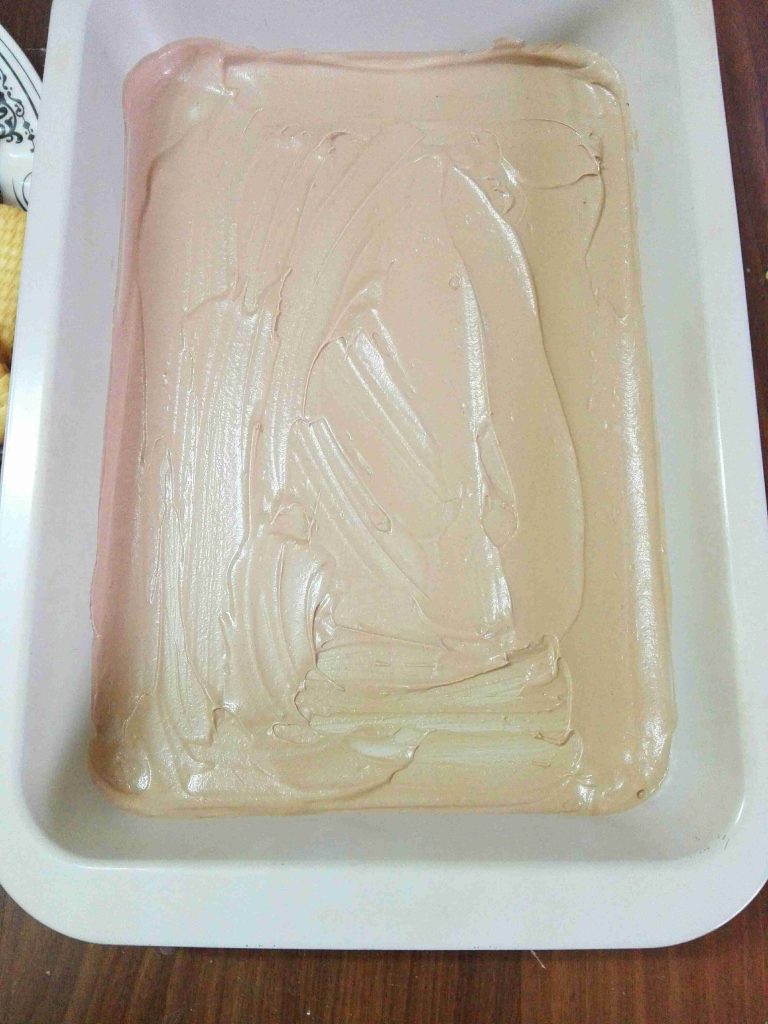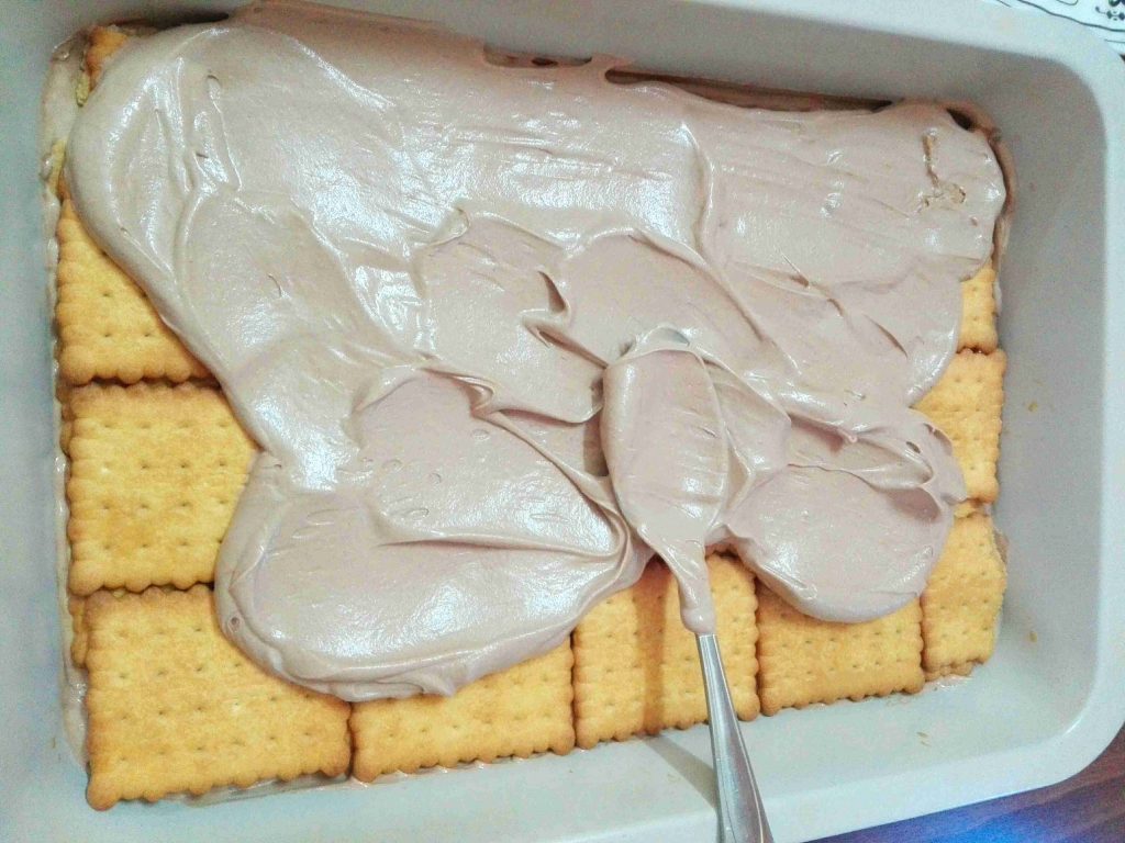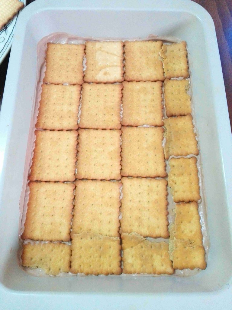 اول طبقه عملتها من طبقتين بسكوت فوق بعض بعدين بنضيف طبقة كريما وبستمر بطبقة بسكوت وطبقة كريما لحتى نخلص الكميه واخر طبقه بدها تكون كريما
