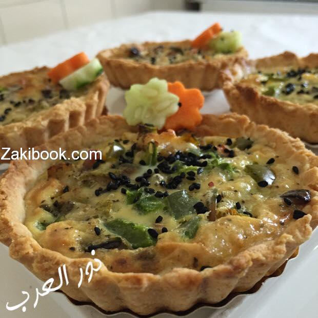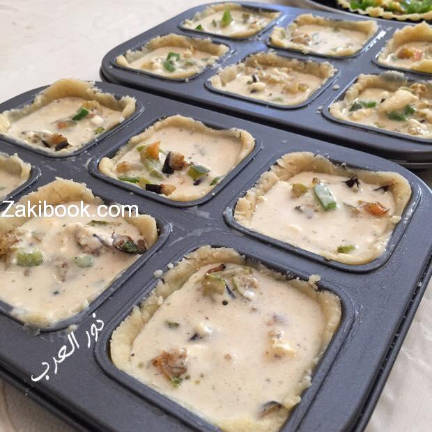 واخلطي بطبق اخر 3بيض وكوب حليب ورشه ملح وفلفل اسود و3ملاعق دقيق …وطلعي التارت من الثلاجة وضيفي كمية من الحشوة وصبي فوقها كمية من الخليط اللي بالبيض والحليب