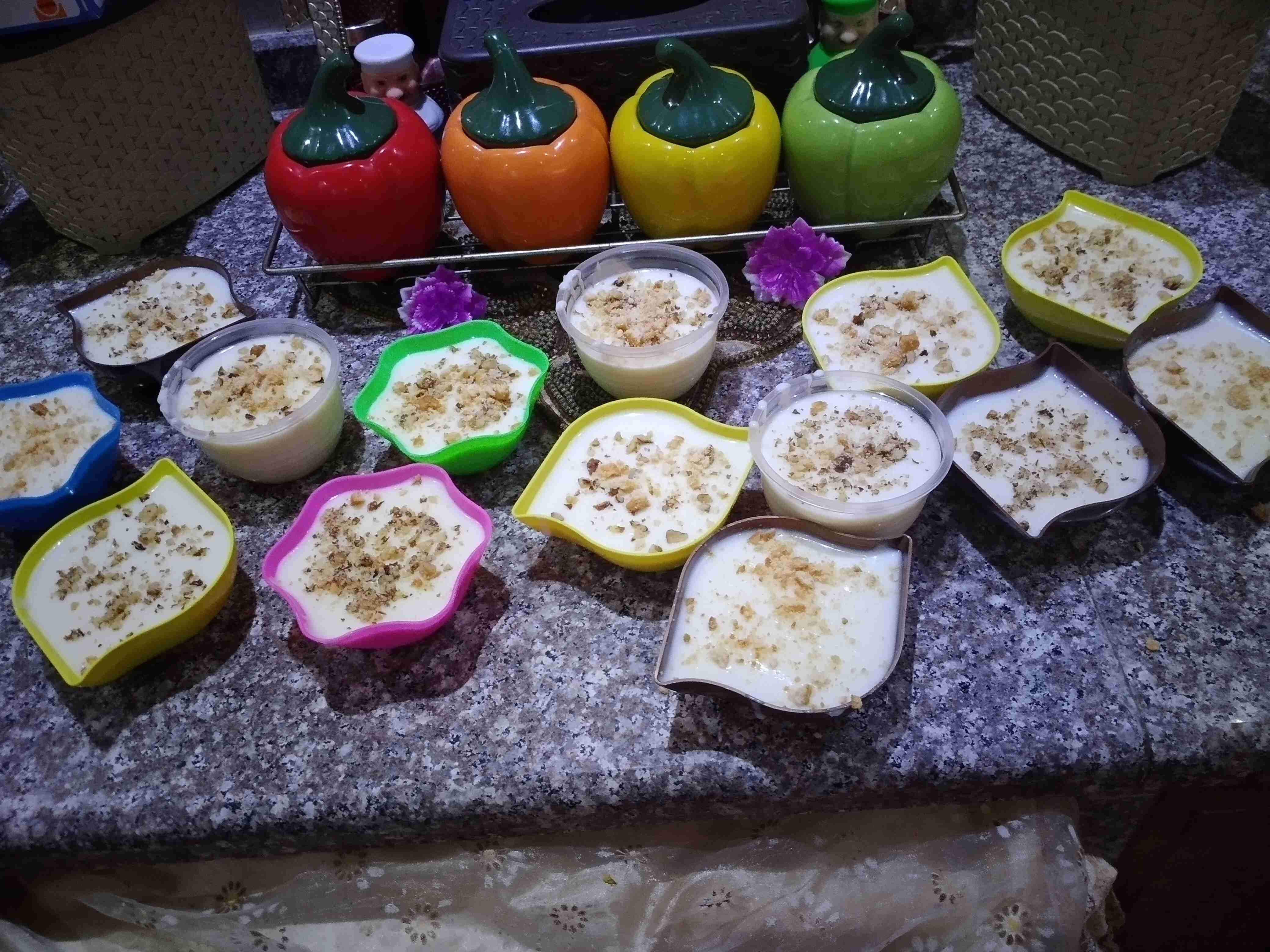 وعلى نار وسط مع تحريك المستمر لحتا يثقل الخليط وبعد هيك منطفي الغاز ومنخلي يبرد لمدت ١٠دقاق منضيف على الخليط مغلفين كريمه ومنضربو بمضرب الكهرباء لمدت ١٠دقاق وتزين بالمكسرات ويوضع بتلاجه وطعمها روعه