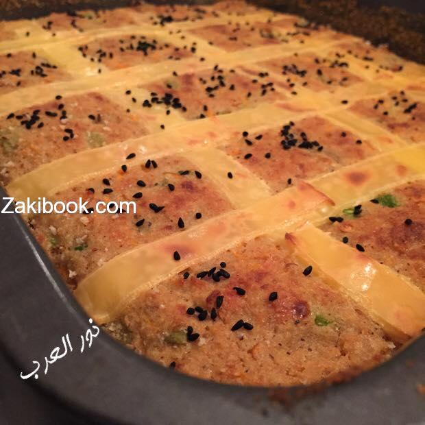 ويضاف الدقيق وملعقة كبيرة بيكنج بودر ولو تحبي تستبدلي الدقيق بالبقسماط نفس الشي روعة ضيفي بالاول كوبين وأخلطي حتى يتكون عندك خليط كخليط البسبوسة وتفرد بقالب مدهون ومرشوش بالبقسماط او الدقيق وتزين من السطح باي زينة ممكن جبن شرائح من النوع اللي مايسيح بالفرن تعمليه شرائط او وردات