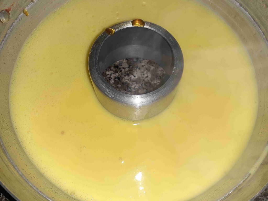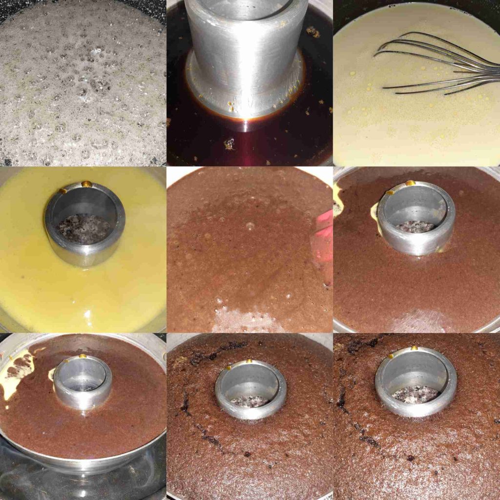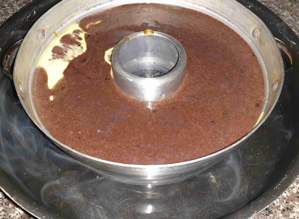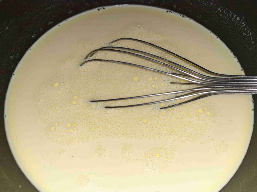 2/ نصع الكريم كراميل والحليب الناشف والسائل والقشطة مع بعض ومنظل نحركهم على الغاز لحتى يجمدو معنا منديرهم فوق الكراميل ومنتركهم على جنب لحتى نعمل الخطوة التالتة الي هيي الكيكة