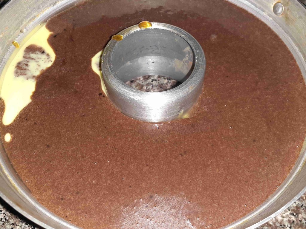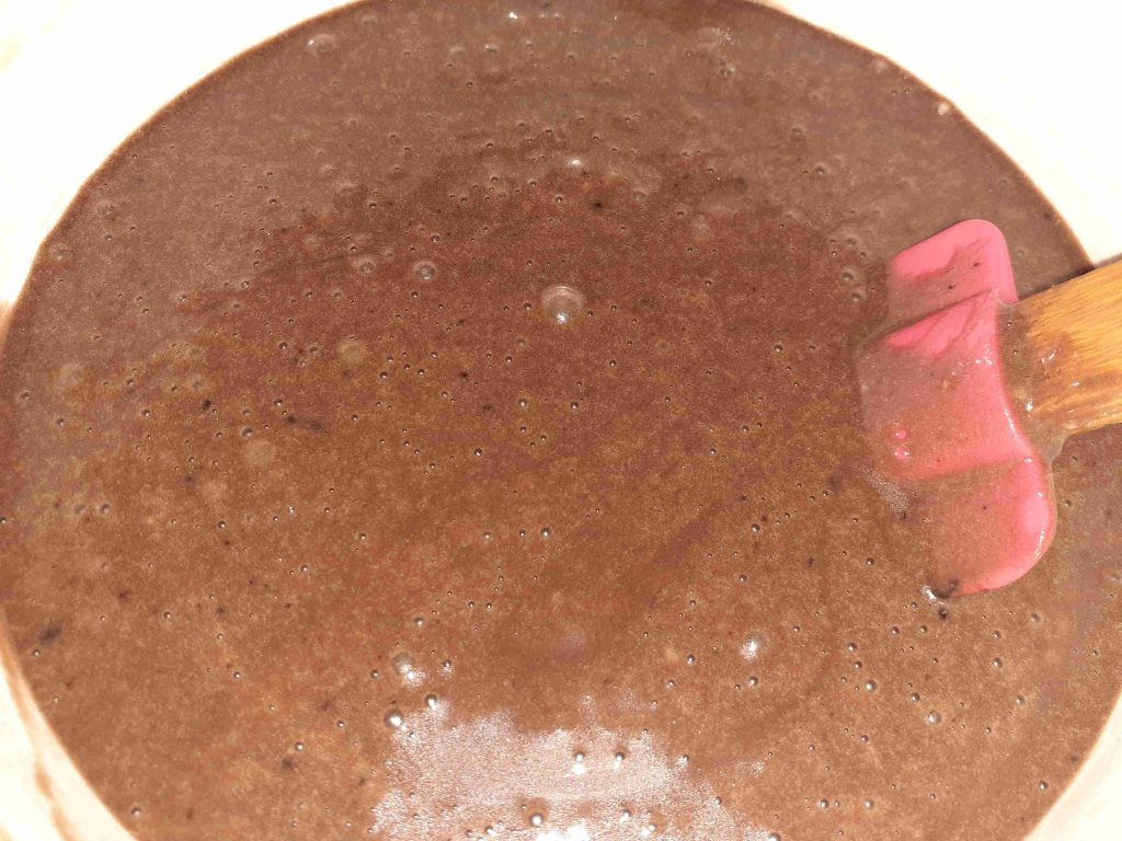 3/ نضع البيض والفانيلا والسكر ومنخفقهم كتير منيح بعدين منحط عليهم الزيت ومنخفق والحليب بعدين مننزل بالطحين والبيكنغ باودر والكاكاو ومنخلطهم منيح ( طبعآ لا تستخدمي الخفاقة الكهربائية لأنو الخفاقة العادية تفي بالغرض ان شاء الله )
