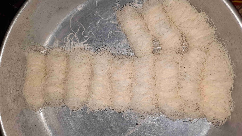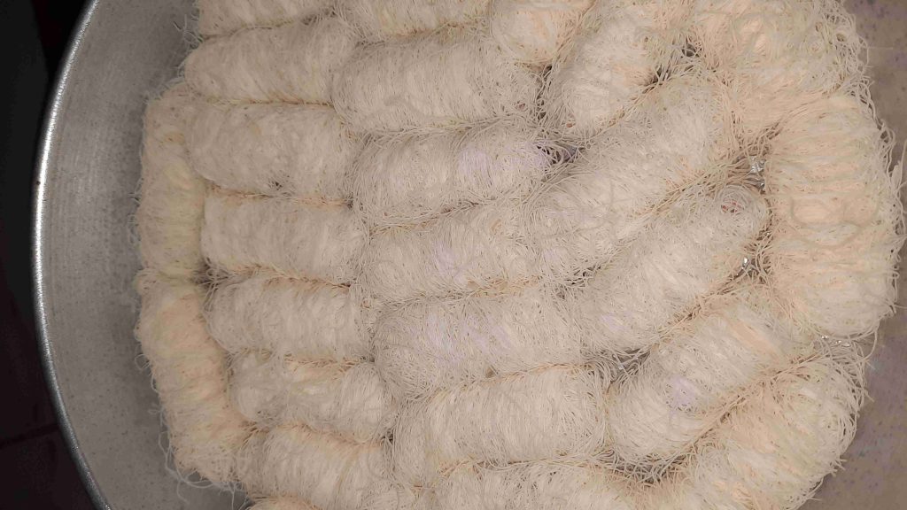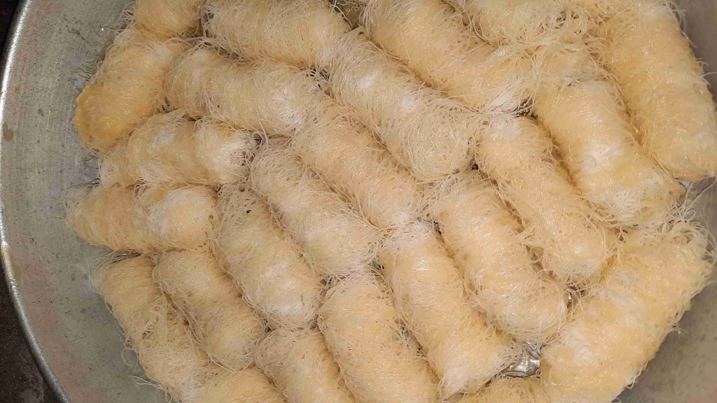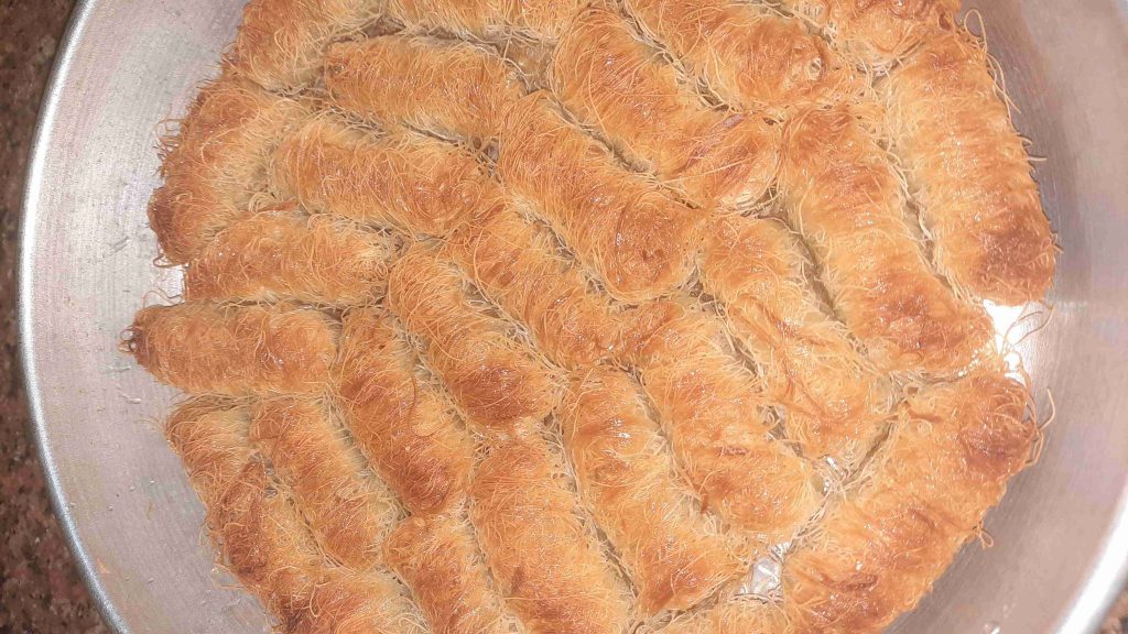 باخد خصلة من الشعر وبحط الفسق الحلبي على الطرف وبلفها اصبع وبكربها مزبوط عشان تمسك معك وبعدين بحطها بصينية الفرن وبس اخلص كل الكمية بجيب السمنة السايحة وبشرب فيها الكنافة ولازم تكون مشربة مزبوط بالسمنة عشان تتقلى وتقرمش وبدخلها الفرن محمى مسبقآ على درجة حرارة متوسطة وبس تاخد لون من تحت بحمر الوجة وبس تطلع من الفرن بصفي السمنة الزيادة وبشربها بالقطر البارد الثقيل وبقدمها باردة بألف صحة وهنا عليكم