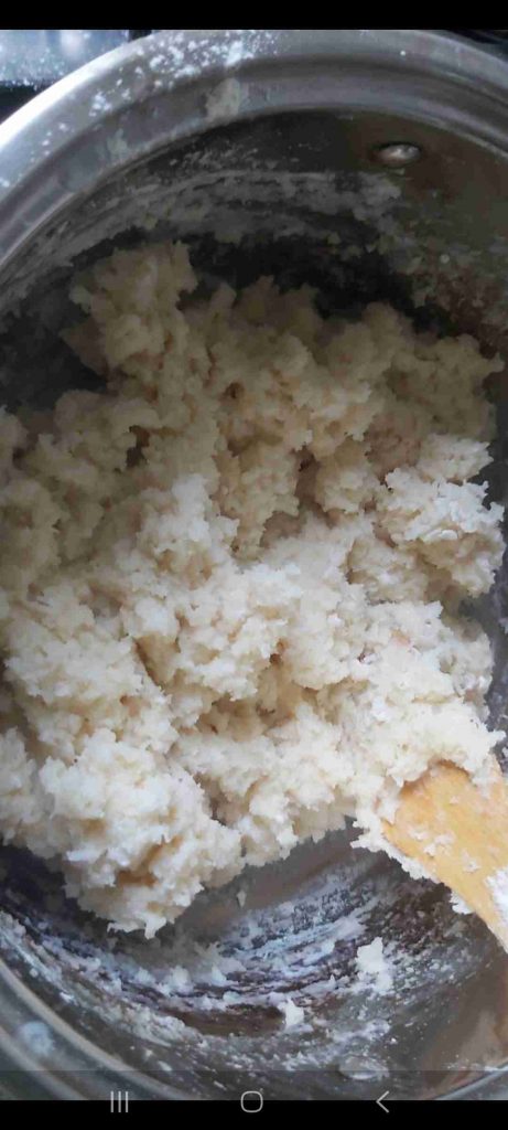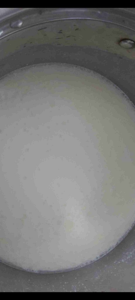أضع الماء والحليب والزيت والفانيلا في قدر واخلكهم جيدا…ثم اضعهم على النار الى ان يغلي الحليب أطفي النار وأضيف الطحين واقلب جيدا الى ان يتشرب الطحين كل الحليب واحصل على عجينة…