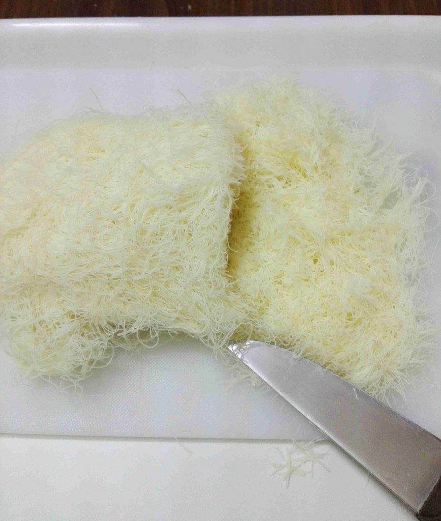 & عجينة الكنافه بفرمها ناعم ممكن عالسكين او بالمفرمه الكهربائيه انا فرمتها عالسكين ونعمتها