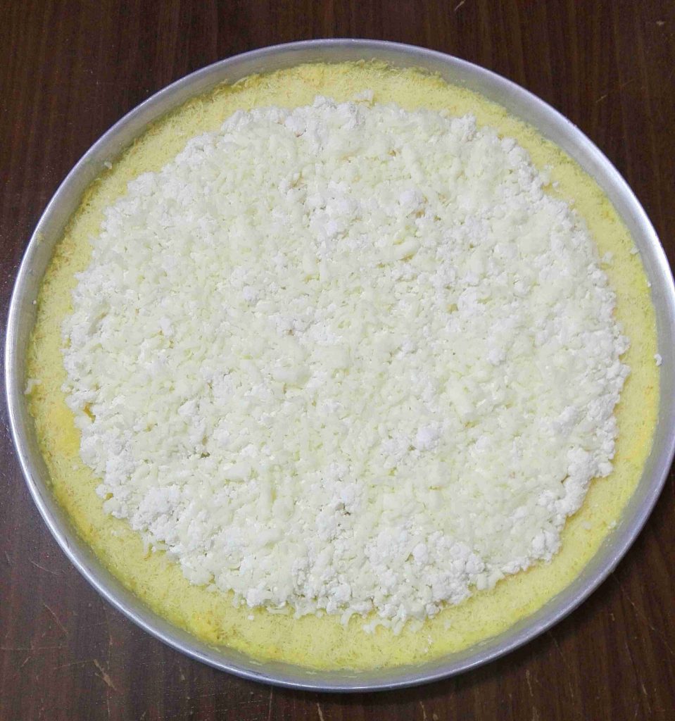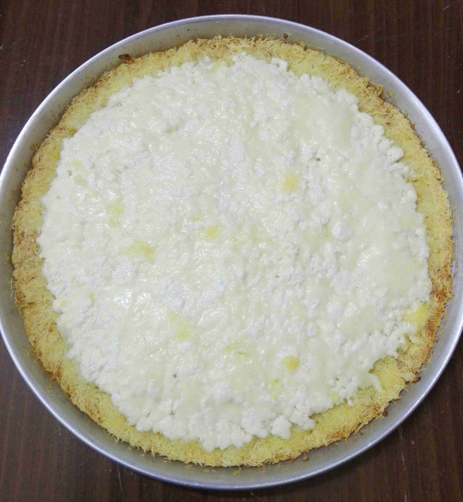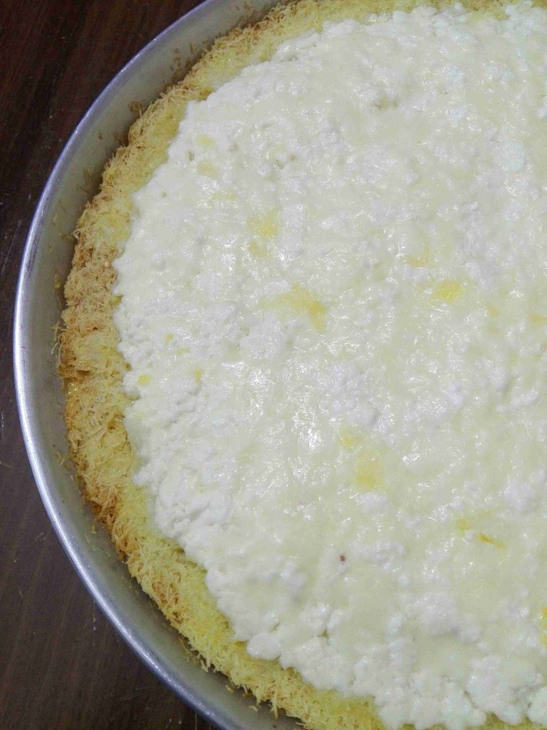 & ثم بوزع عليها الجبنه وبخليها بعيده شوي عن اطراف الكنافه وبضعها عالغاز عالنار اقل من الوسط (والنار لازم تكون عالطرف الصينيه ما بنحطها عالنص عشان ما ينحرق )