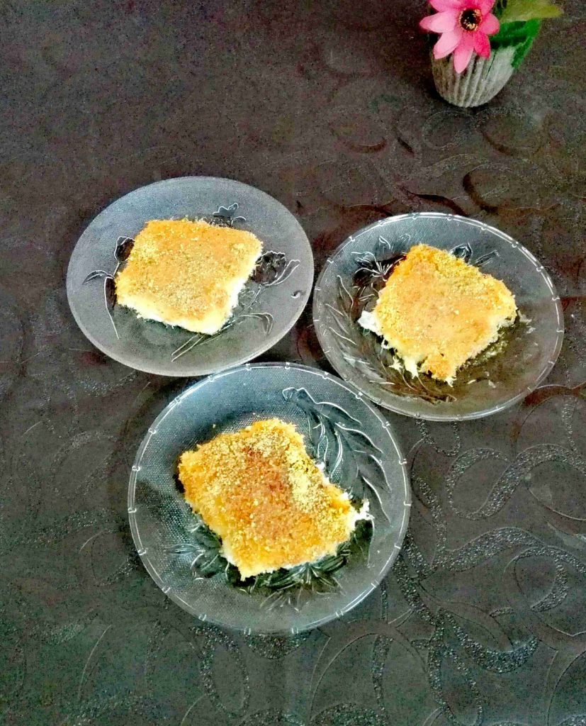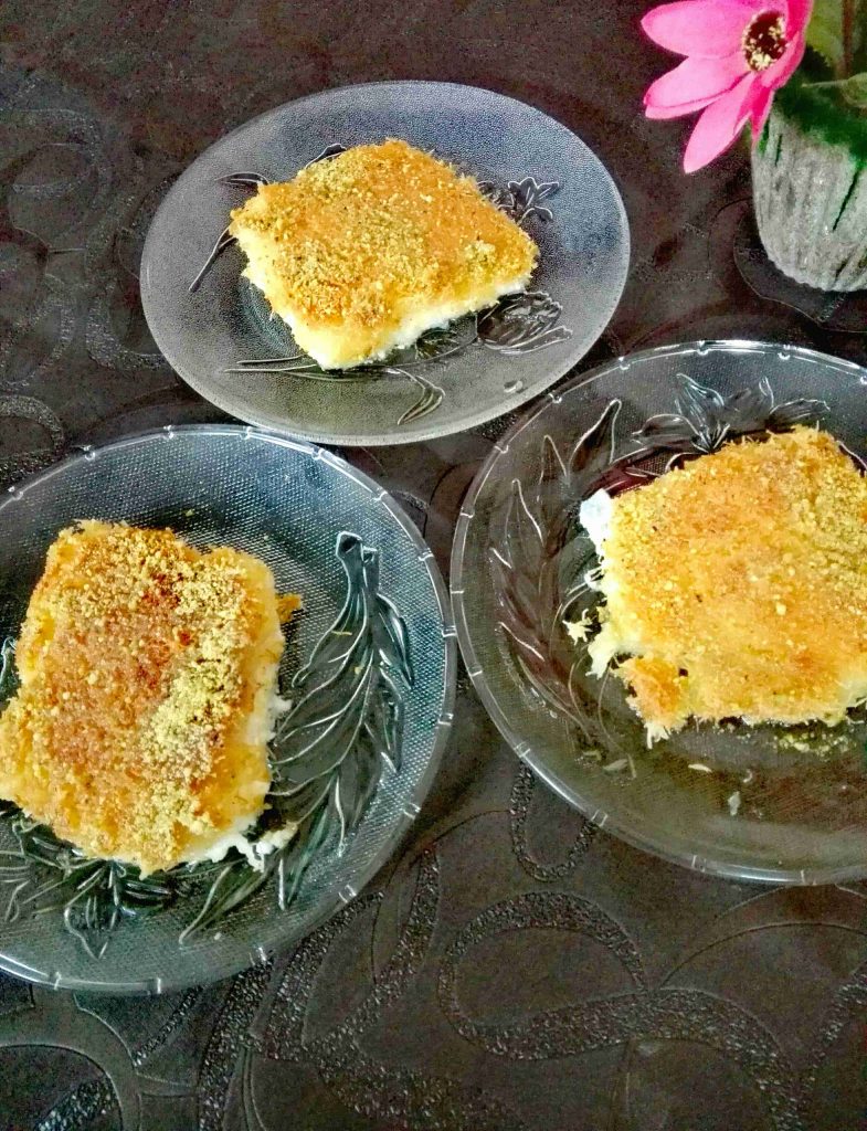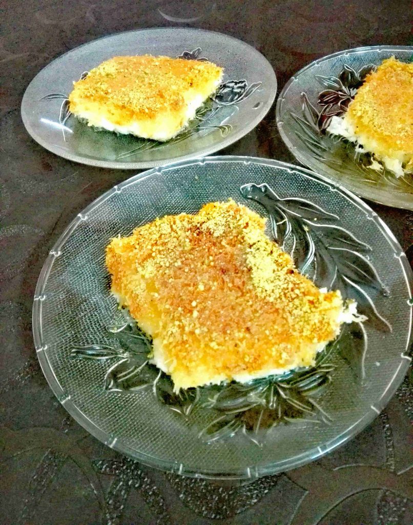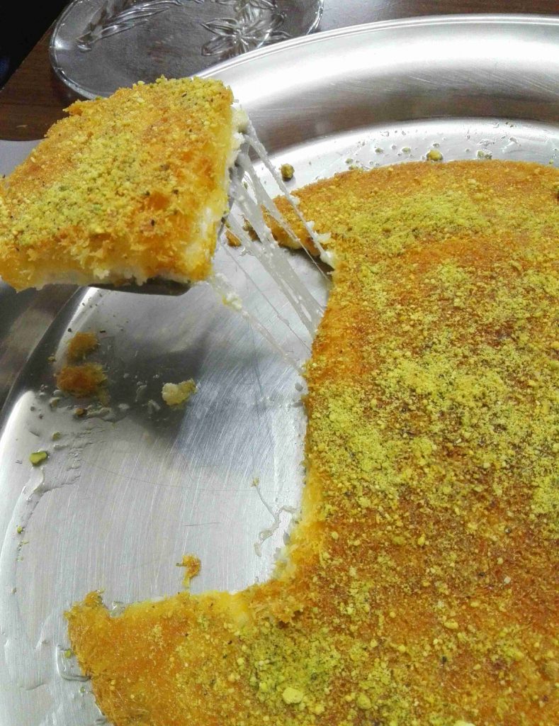 & بعد ما تجهز بقلبها وبخليها ترتاح شوي يعني لدقيقه مش اكثر وبسقيها بالقطر الساخن وبزينها بالفستق الحلبي وبقطعها وبقدمها وصحه وعافيه