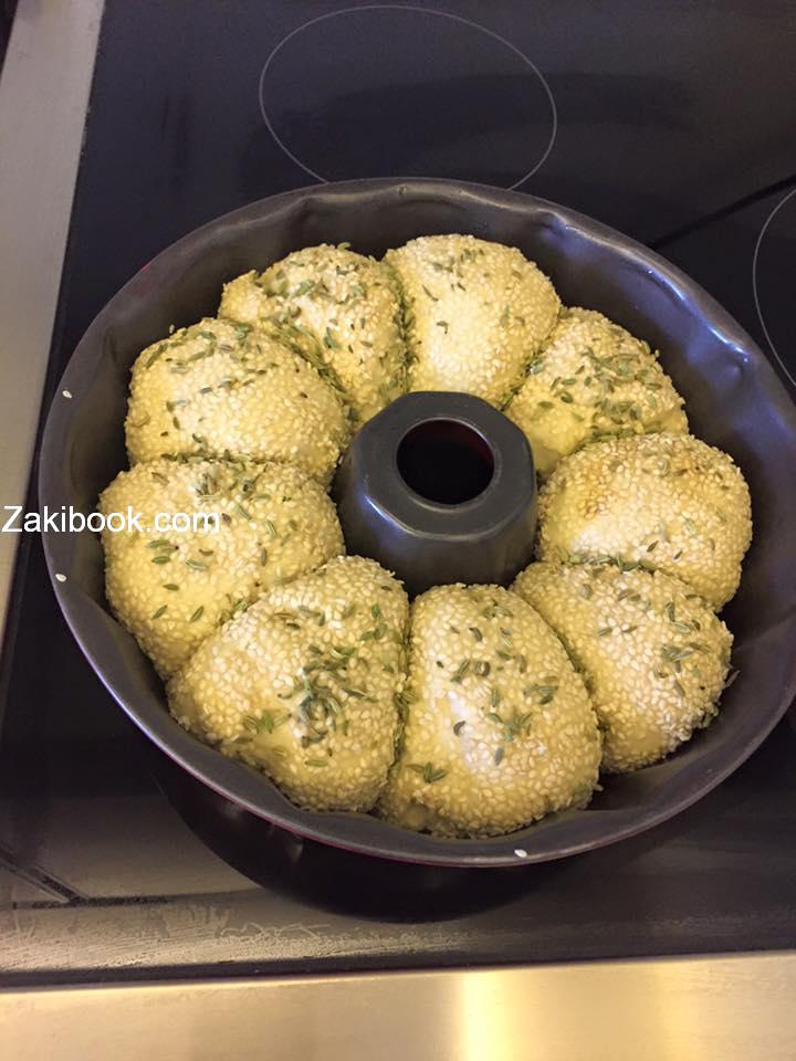 نغمس القطع بالحليب ثم بالسمسم ونصف الخبز في صينيه مدهونه بالزيت وننتظر الي الن يختمر العجين مره اخري ونخبز في فرن متوسط الحراره الى ان نصل للون المطلوب. بعض الافران تحتاج لاشعال الشوايه من اعلى للتحمير وصحتين
