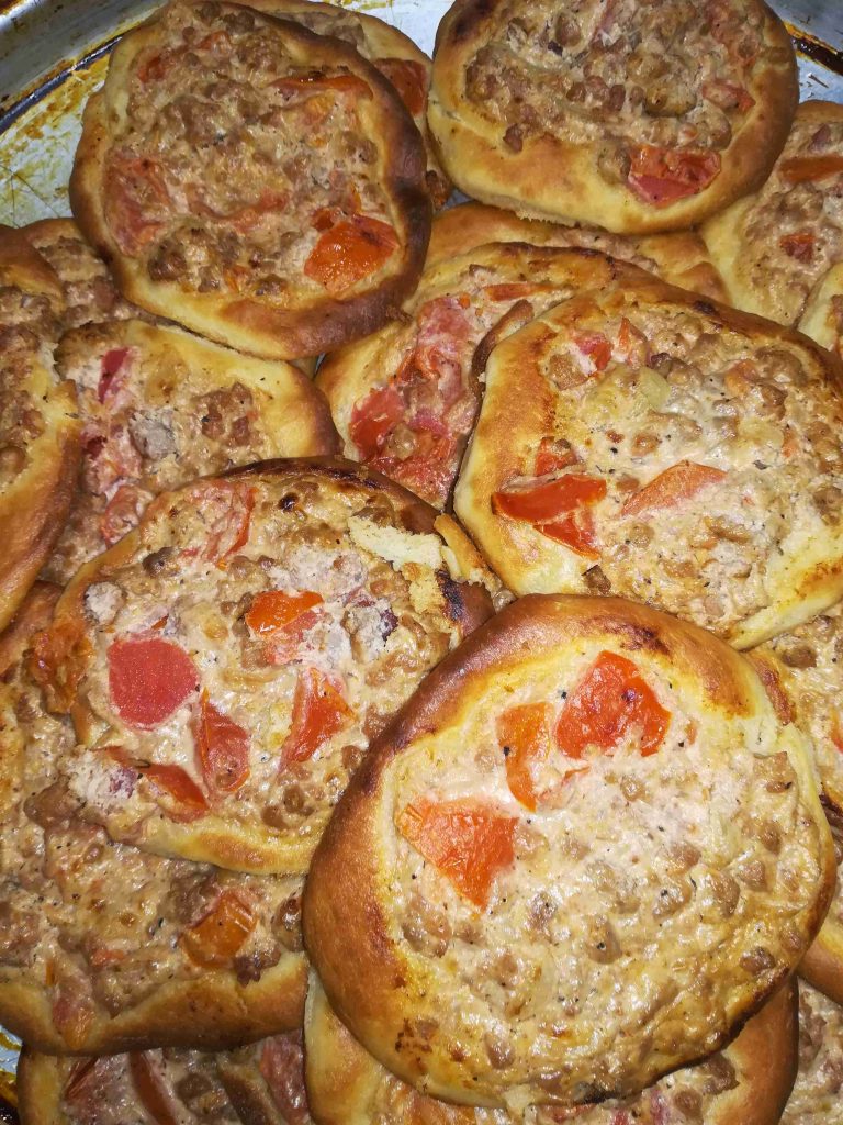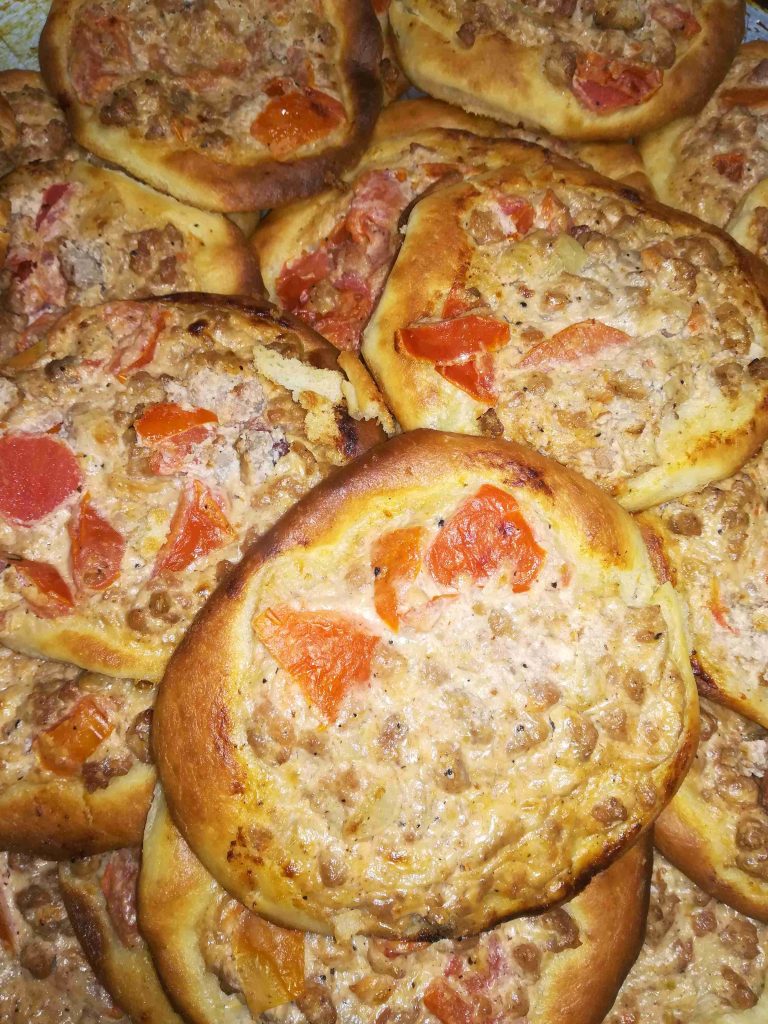 اولا نعمل عجينة العشر دقائق حسب الكمية انا عملت مقدارين…… نقطع البصل صغير ونضع البصل على الغاز مع اللحمة لبستوا.. وقطع البندورة ونضعها عجنب ما لا توضع مع الحشوة لأنها بتنزل مي…. عند استواء الحشوة نضعها في صينية ونضع البندورة أهم اشي ما تكون مي عليها عشان تمسك الطحينة… ونضع الطحينة وملح ازا بدها ونضعها بالفرن للتحمير
