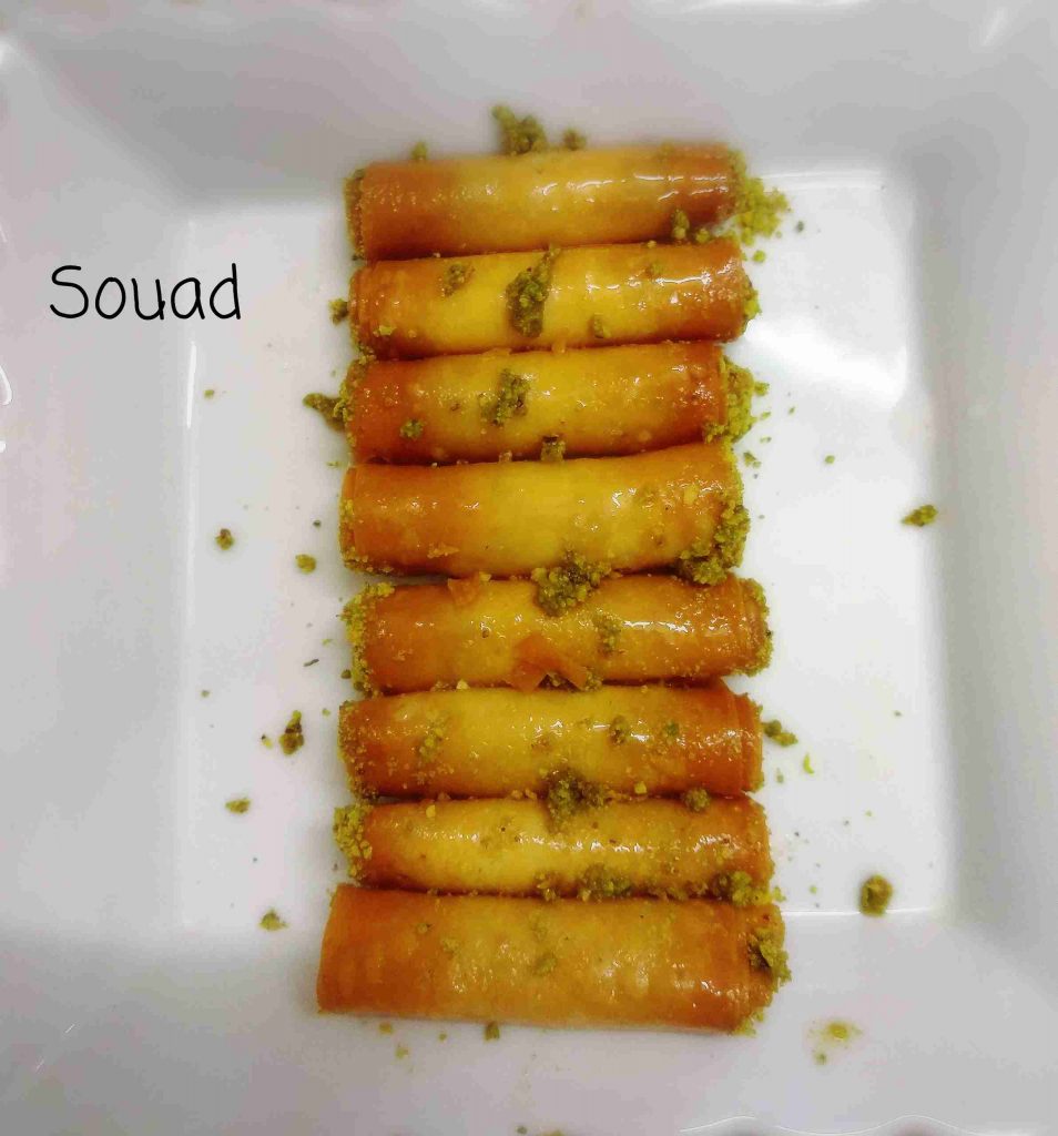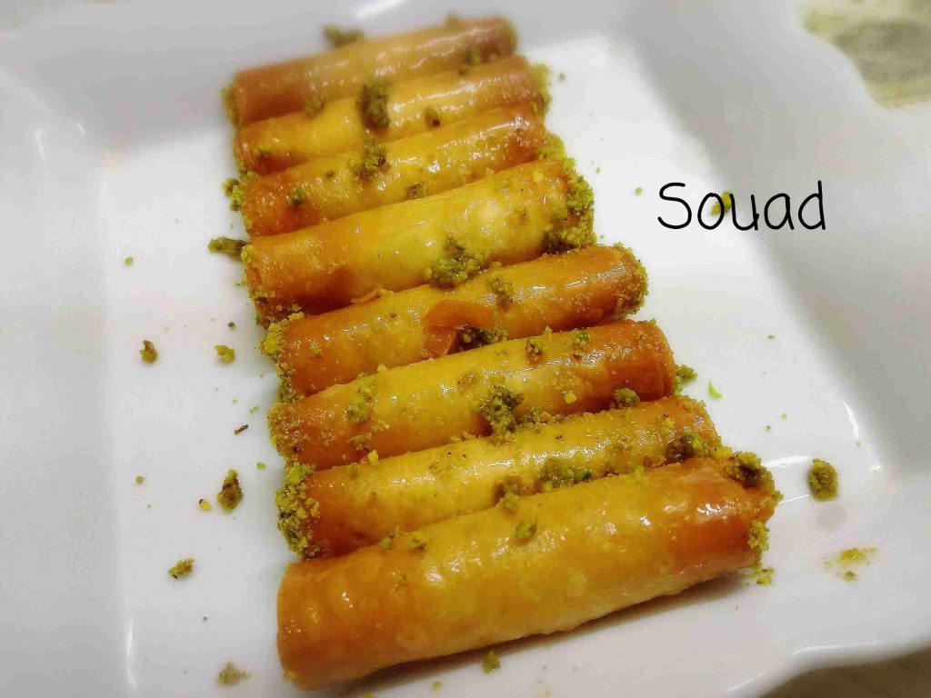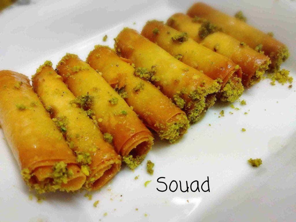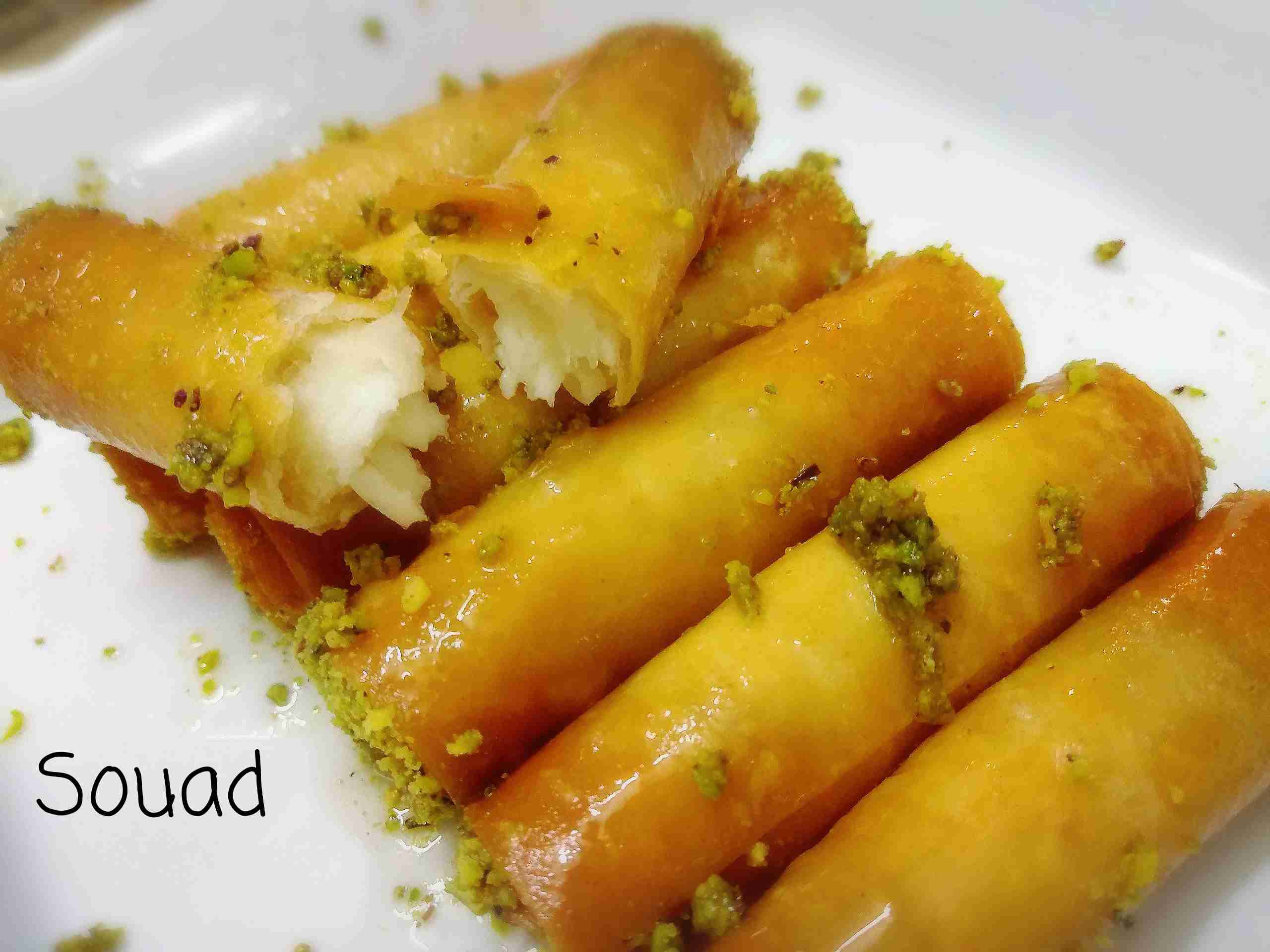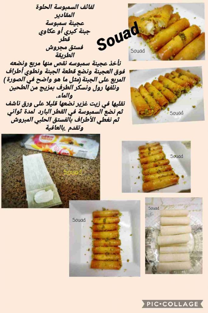 نقليها في زيت غزير نضعها قليلا على ورق ناشف ثم نضع السمبوسة في القطر البارد لمدة ثواني ثم نغطي الأطراف بالفستق الحلبي المبروش وتقدم .بالعافية