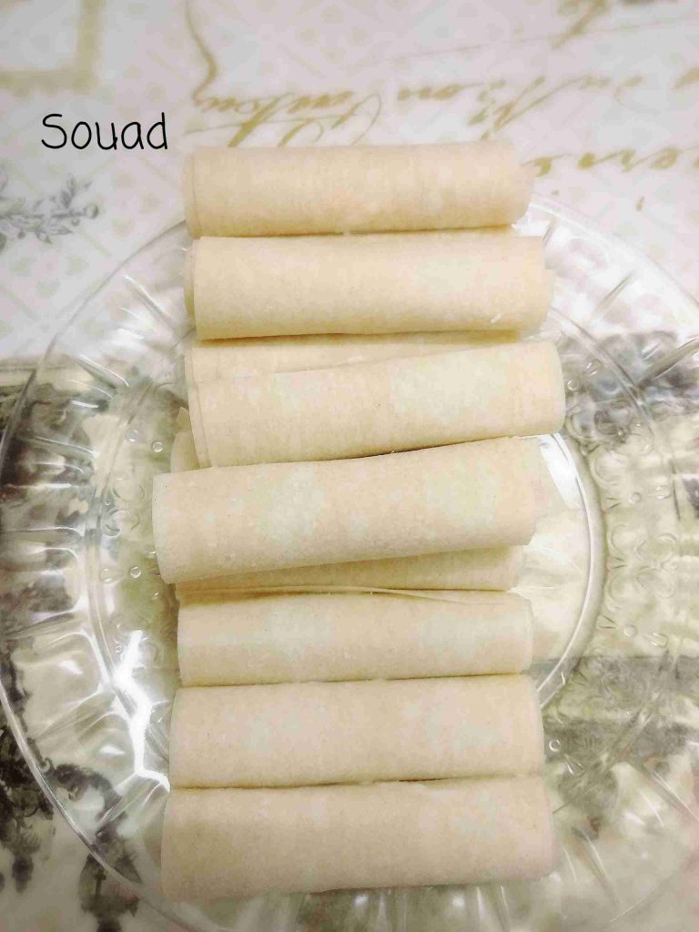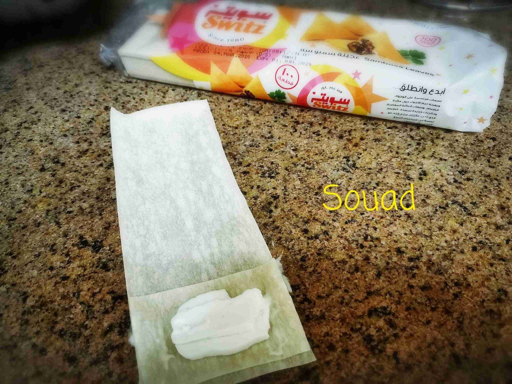 نأخذ عجينة سمبوسه نقص منها مربع ونضعه فوق العجينة ونضع قطعة الجبنة ونطوي أطراف المربع على الجبنة(مثل ما هو واضح في الصورة) ونلفها رول ونسكر الطرف بمزيج من الطحين والماء.