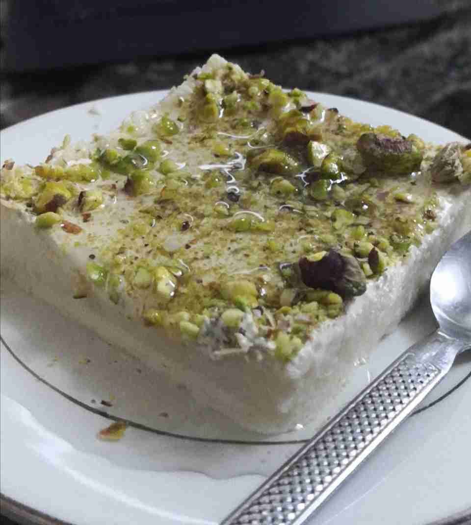 يسكب الخليط في بايركس ويوضع في الثلاجه على الاقل ساعتان، يزين بالفستق الحلبي والقطر عند التقديم.