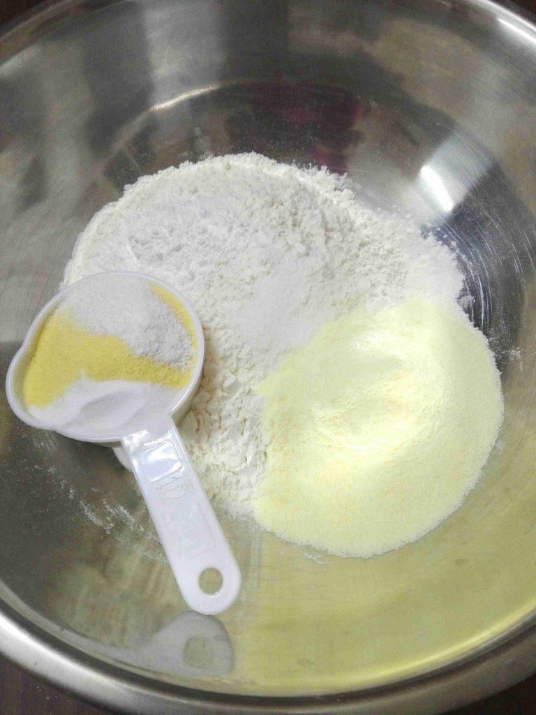 & بنخلط المواد الجافه مع بعض السميد والطحين والبكنح باودر والكربونه ورشة ملح وحليب البودره والفانيلا