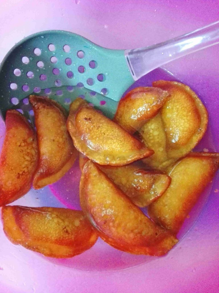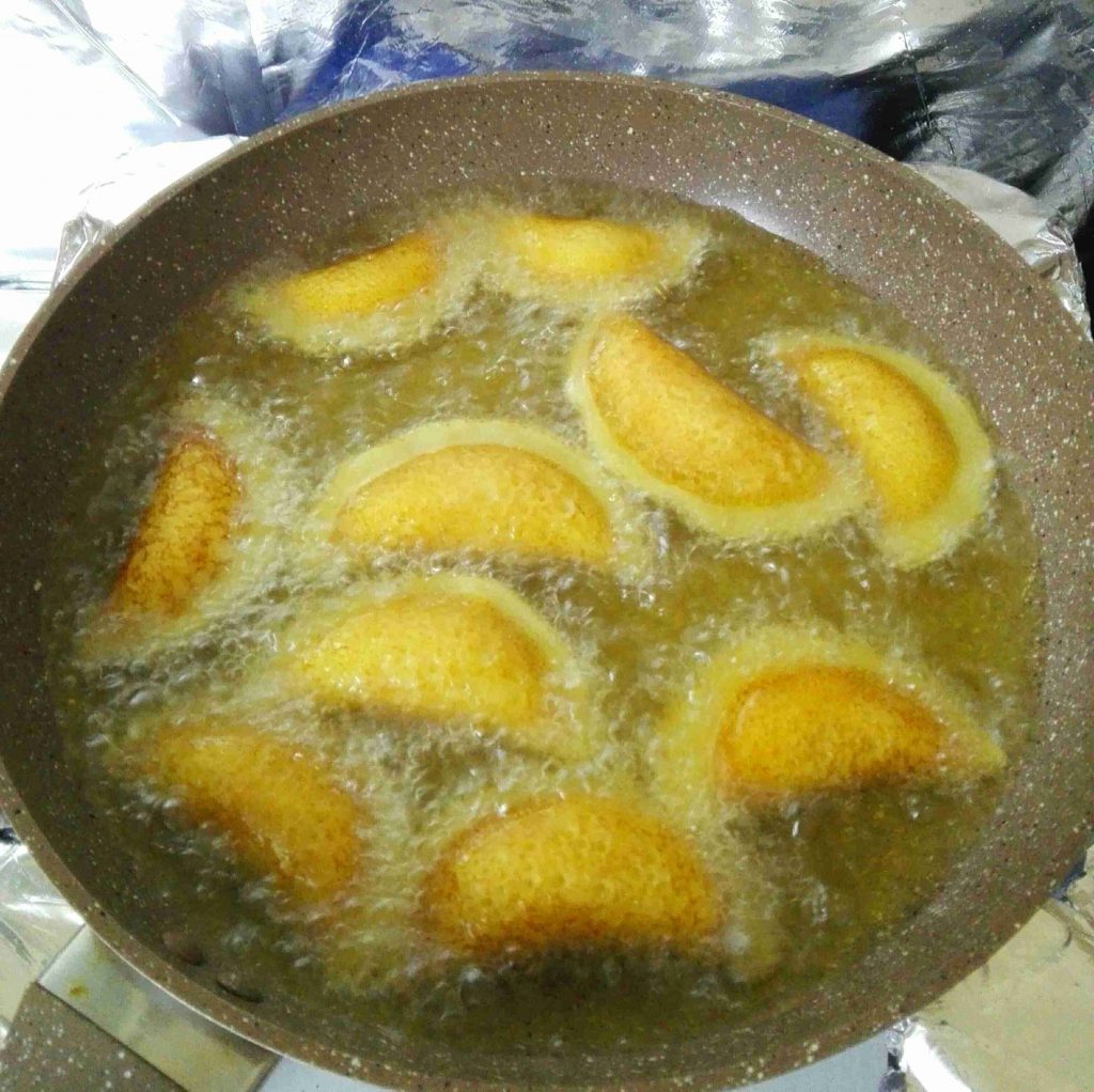 بنقليه بزيت غزير وحامي ولما يوصل للون المطلوب بنشيله وبنضعه بقطر بارد (القطر لا ثقيل ولا خفيف قوامه وسط )