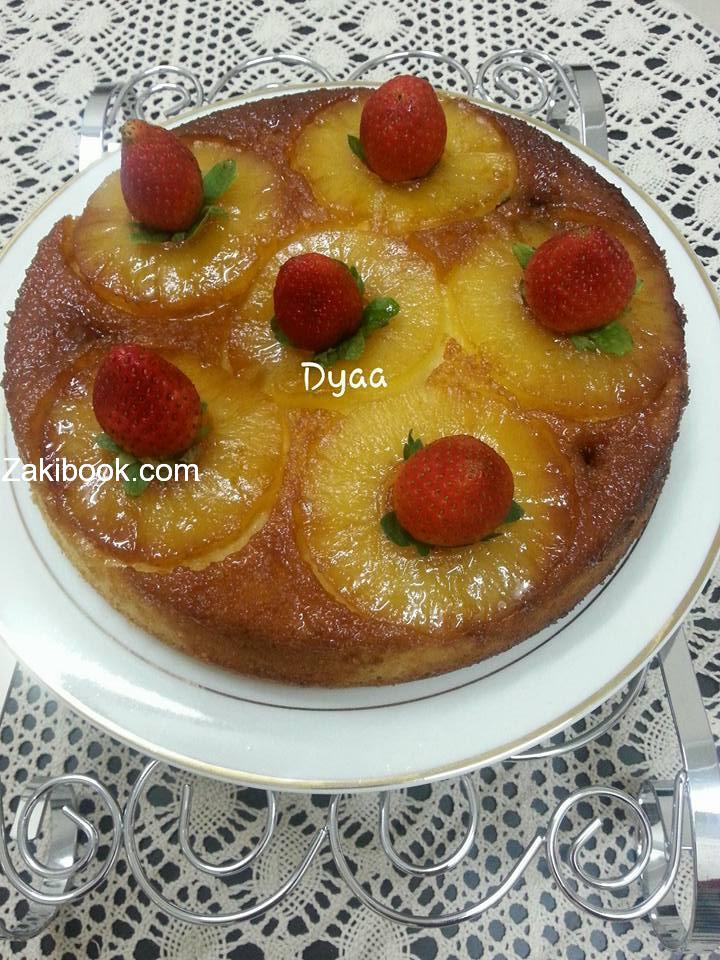 ترتب شرائح الاناناس فوق السكر .ثم تدهن حواف القالب بالزيت او الزبدة ويصب خليط الكيك عليها ويدخل الفرن مدة 40 دقيقة على حرارة 180 اول 10 دقائق ثم يخفف الى 150 لبقية الوقت.