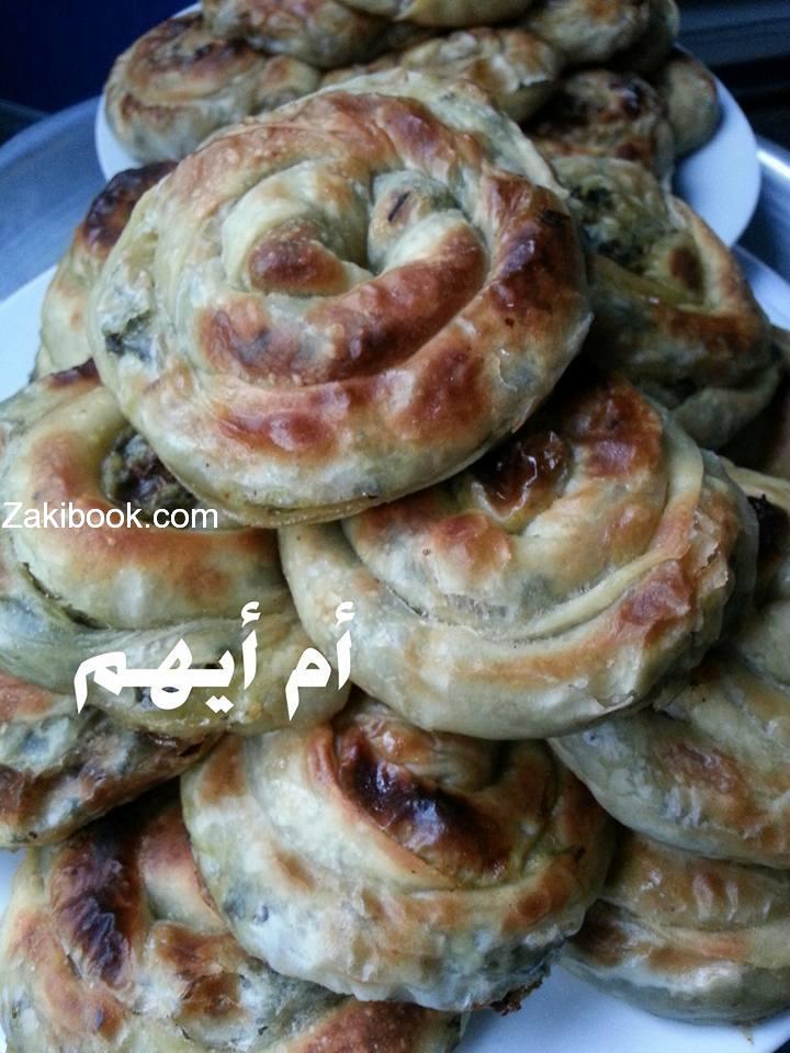 كيلو طحين ،،نصف ملعقة صغيرة ملح ،،قليل من الزيت ،،باكو باكنج باودر تعجن بالماء الدافئ وتترك ترتاح نصف ساعة ،،نقطعها دوائر صغيرة ثم نرقها دائرية رقيقة جدا وشفافة ،،ندهن وجها بالزيت ونقطع الدائرة من المنتصف ،،نحشيها اما سبانخ او لحمة وبصل ،،،نلفها طولي ثم دائري ونضعها في صينية مدهونة بالزيت ،،تخبز في الفرن من اسفل ثم يحمر الوجه ،،أم أيهم