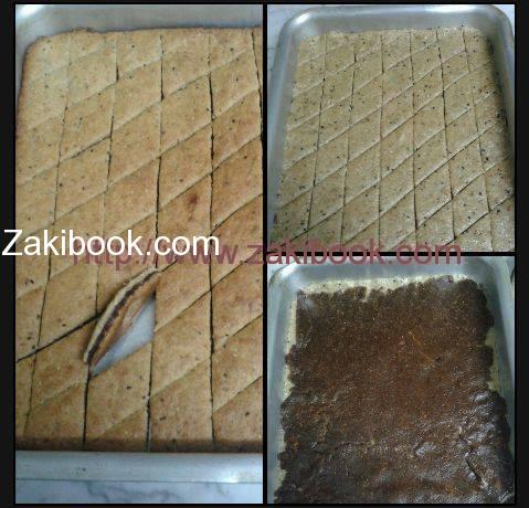 بعد ذلك نقسم العجينة لقسمين، نأخذ أول قسم ونفرده فوق صينية مدهونة بقليل من الزبدة، ثم نفرد فوقه حشوة التمر الجاهزة، ونفرد فوقمها القسم الأخيرة من العجينة وبهذا الشكل نتحصل على ثلاث طبقات، نقطعها كما هو موضح في الصورة، ثم دخلها لفرن ساخن على 180 درجة، حتى تنضج وتحمر.