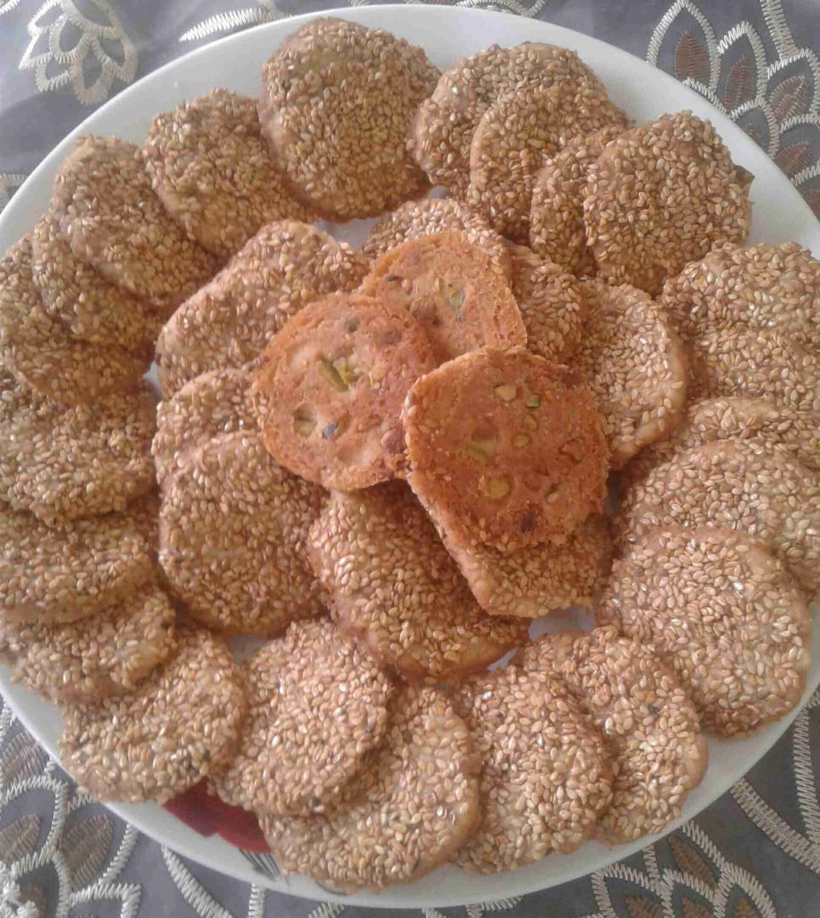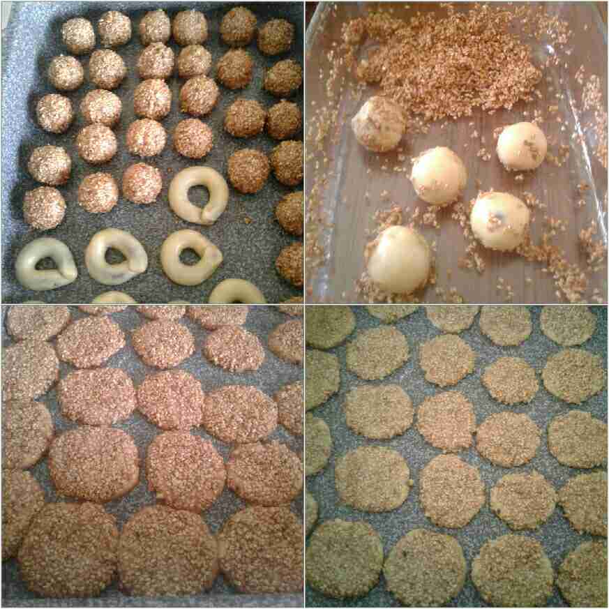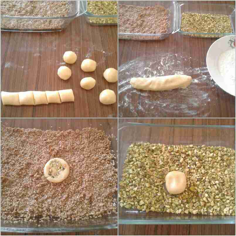 – نغمس الوجه الأول في الفستق ، ثم الوجه الثاني في السمسم ، ونرقها أثناء تغميسها بالسمسم ، ثم نرفعها ونضعها في صينية غير لاصقة، ونصف الحبات بجانب بعضها مع عدم ترك مسافة كبيرة بينها.