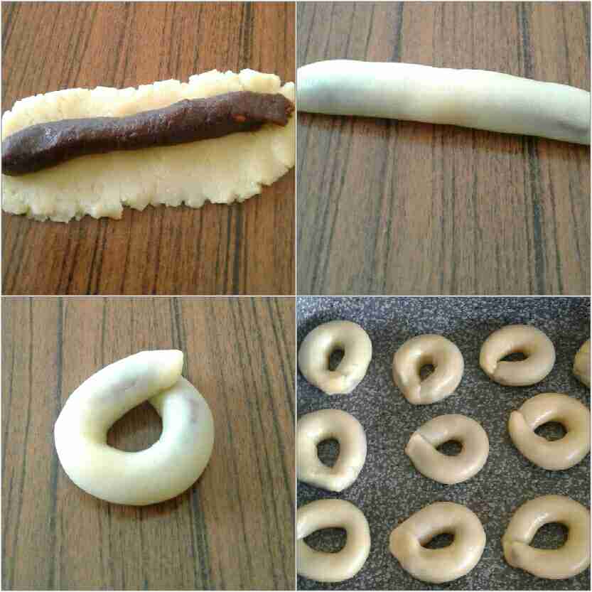 – في وعاء: نخلط الطحين والسمن ورشة الملح ونعجنها حتى تمتزج ببعضها جيدا وتصبح شبيهة بعجينة الغريبة، ثم نغطيها ونضعها في الثلاجة مدة نصف ساعة.