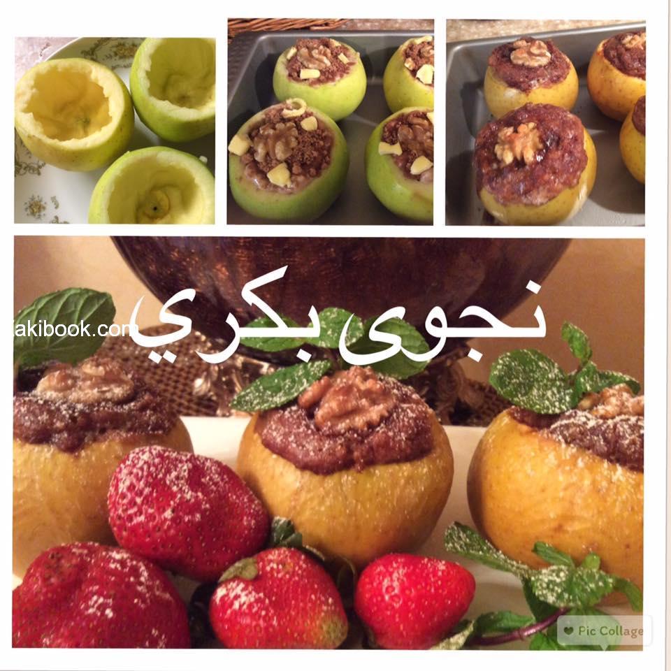 بالتفاحات الفارغه…. ثم نخلط السكر والقرفة ونرشه فوق كل تفاحه ونضع قطع صغيره من الزبده وتزين كل تفاحه بحبة جوز كامله ثم توضع حبات التفاح بصينيه الفرن وتخبز بفرن حامي على درجة حراره 180 لمده 20 او25 دقيقه ثم ترش بقليل بسكر البودره وتقدم دافئه ..