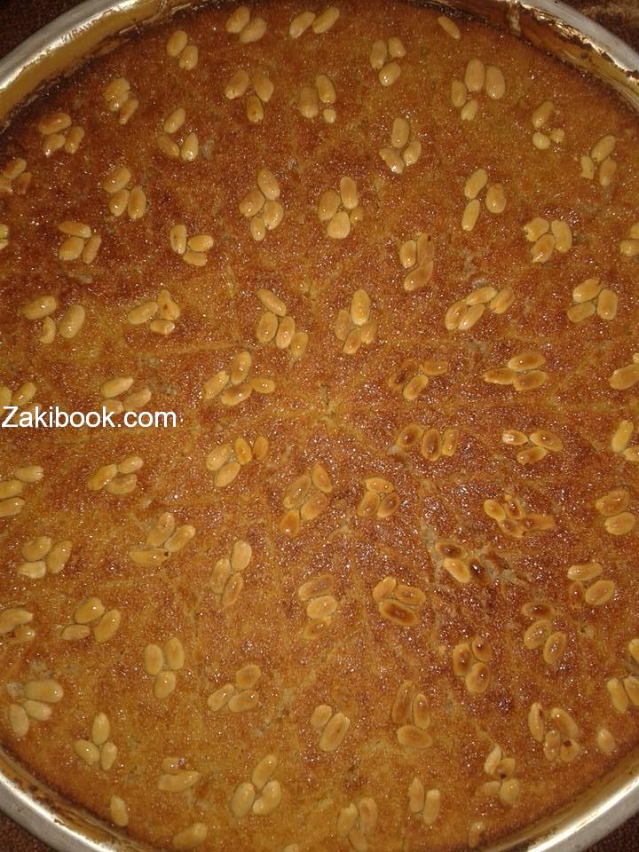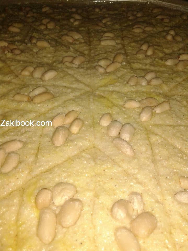 بدهن صينية بطحينية وبفردها وصرت ابلل ايدي بالسمنة السائلة وافردها ﻻنها بتغلب وبتلزق باﻻيد وبقطعها برضه شوي شوي وزينتها بالفستق الني وتركتها 3ساعات اوساعتين