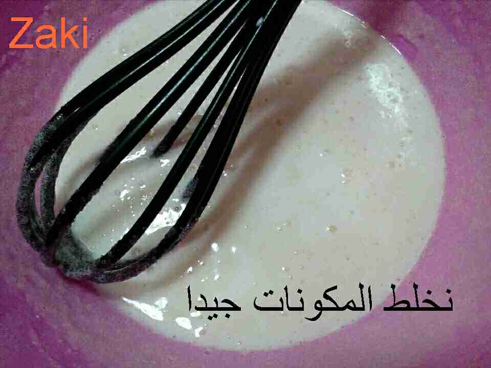 نخلط البيضة، مع السكر الڤانيلا ،قبصة الملح ثم نضيف الماء و نخلط حتى ينسجم الخليط جيدا.