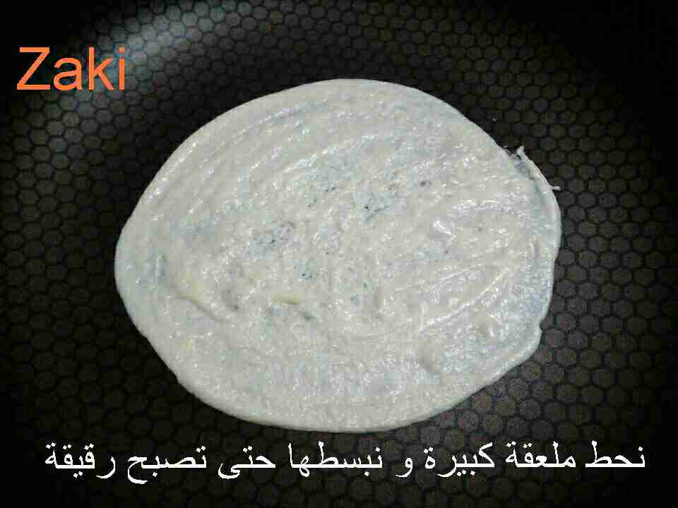في مقلاة تمنع الإلتصاق على نار هادئة جدا ، نحط مقدار ملعقة كبيرة مملوءة،و نسرحه بظهر ملعقة صغيرة بسرعة طبقة رقيقة على شكل دائرة.