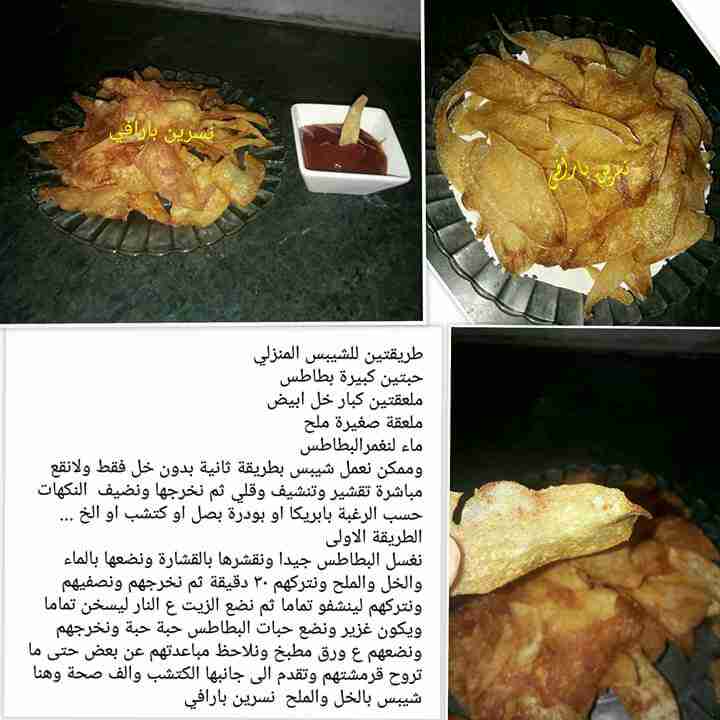 ملاحظة ممكن نعمل شيبس بطريقة ثانية بدون خل فقط ولانقع مباشرة تقشير وتنشيف وقلي ثم نخرجها ونضيف النكهات حسب الرغبة بابريكا او بودرة بصل او كتشب او الخ …
