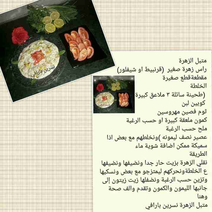نقلي الزهرة بزيت حار جدا ونضيفها ونضيفها ع الخلطةونحركهم ليمتزجو مع بعض ونسكبها وتزين حسب الرغبة ونضفلها زيت زيتون إلى جانبها الليمون والكمون وتقدم والف صحة وهنا جربوها راح تعجبكم