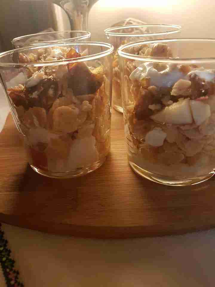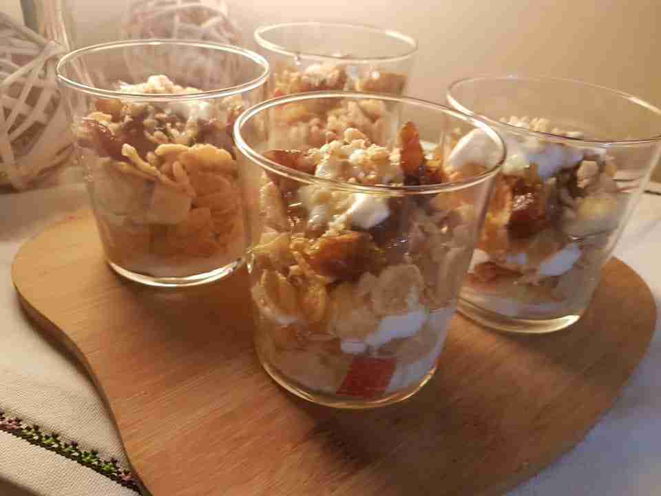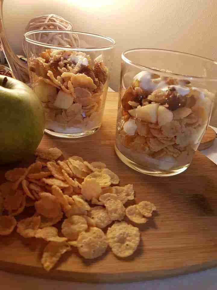 نضع طبقه تفاح مقطع مكعبات وطبقه كورن فلكس وطبقه لبن ونكرر الطبقات حسب الرغبه وعلى الوجه نزين بالعسل والتمر والمكسرات