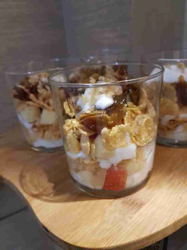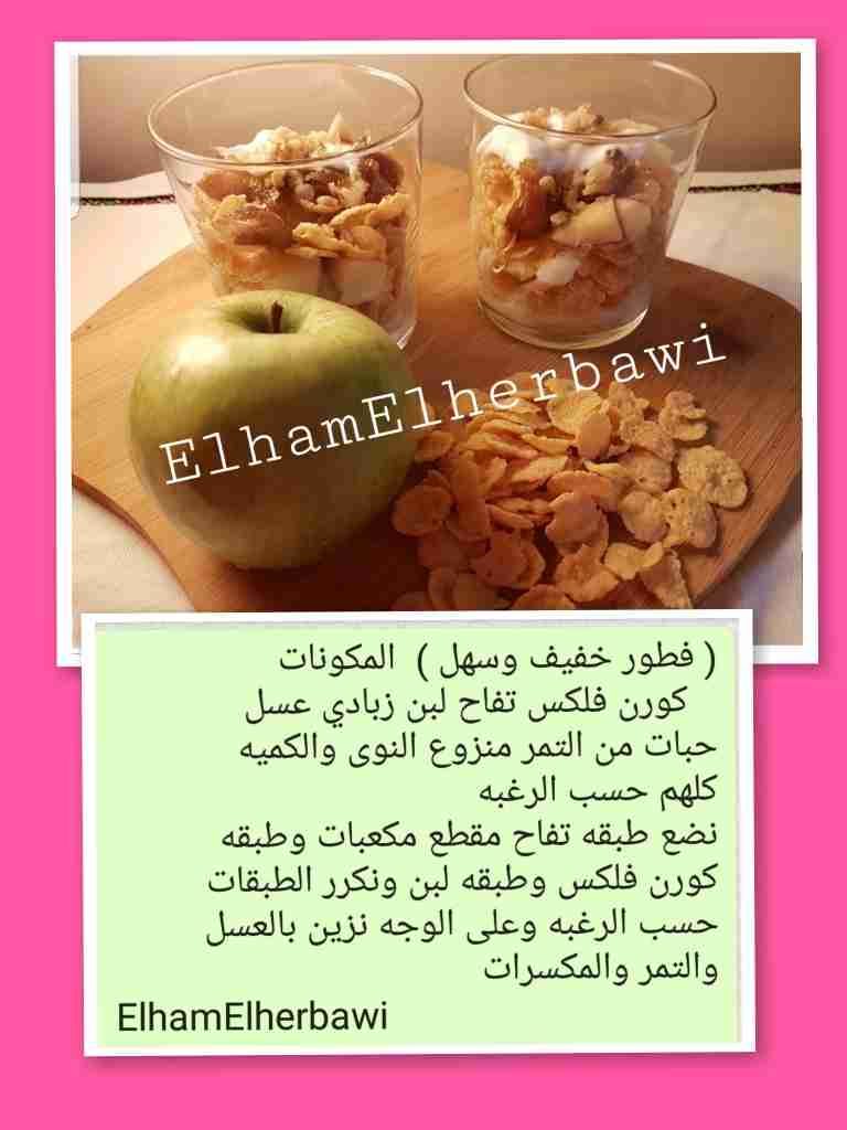 كورن فلكس تفاح لبن زبادي عسل حبات من التمر منزوع النوى والكميه كلهم حسب الرغبه