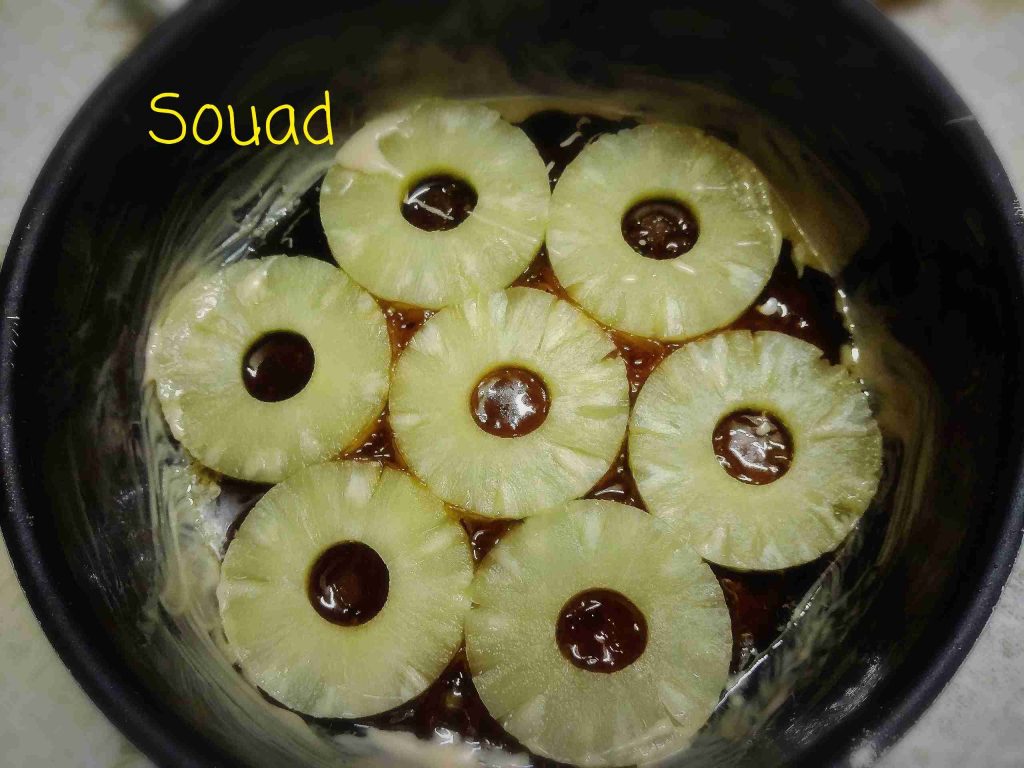 في صينية الكيك نضع ٣ ملاعق سكر وسط وملعقة صغيرة زبدة ونكرملهم على النار ثم نضع فوقهم شرائح الأناناس.